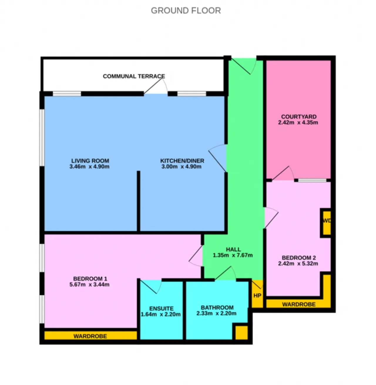 Bedroom 2 2.42m x 5.32m Double with access onto private balcony. Build in wardrobes. Carpeted flooring.