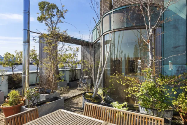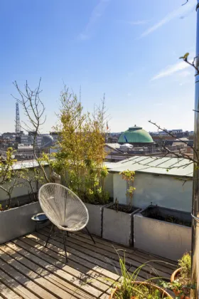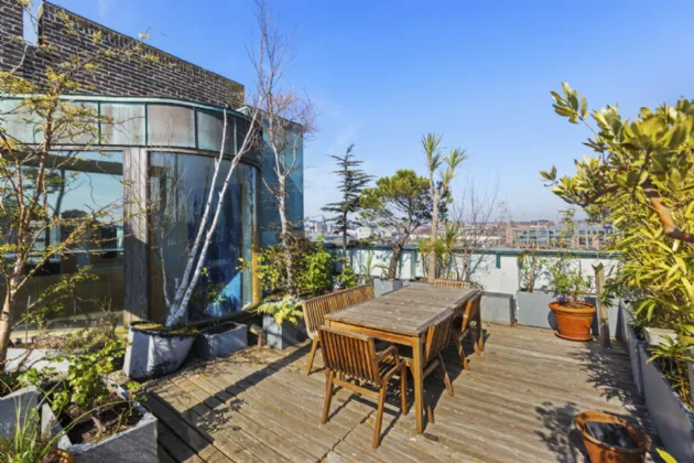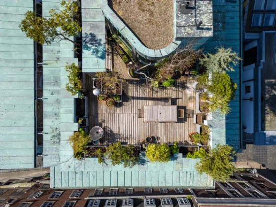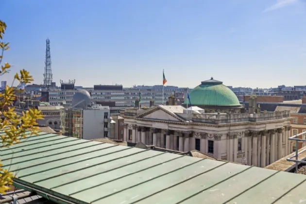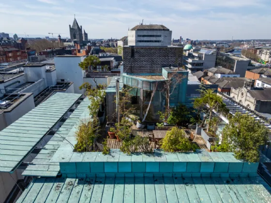 The private roof garden perched at the top of this award-winning building is one of the finest examples of its kind in the city. The current owners have created a beautifully mature garden, with carefully chosen plants, shrubs and trees providing a stunning oasis in the heart of the city. Nearly every landmark in the city can be seen from the roof garden including the Poolbeg Towers to the east, the Wellington monument in the Phoenix Park in the west, and as far The Sugar Loaf in the south and the Dublin Mountains.
