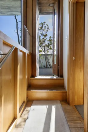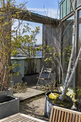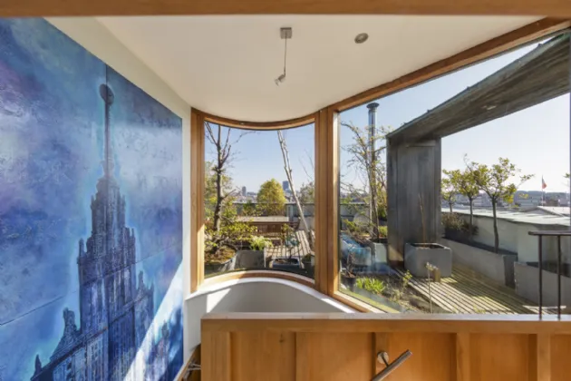 Following the stairs to the second level, the roof garden comes into view creating a wonderful sense of oasis in the heart of the city. Atop the stairs you will find the most unique room to be found in any city centre home – the library. Finished in American Oak, there is a warm, sophisticated atmosphere, creating a cosy retreat to relax in at the end of the day. An oak staircase encompasses the room leading to the mezzanine level above making full use of the impressive 4.2m ceiling height, while also giving access to a guest shower room. Two full height windows fill the room with natural light while also creating perfectly framed views of the city. A neat 'hatch opening’ from the library to the landing allowing the evening sun flow through to the roof garden.