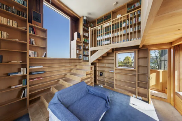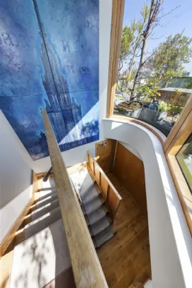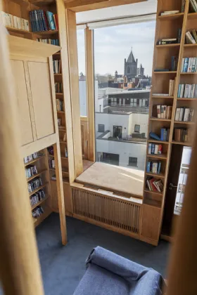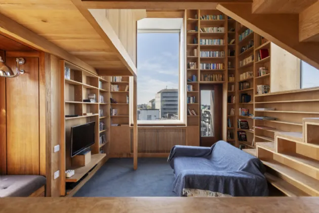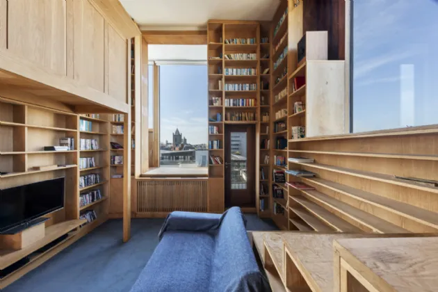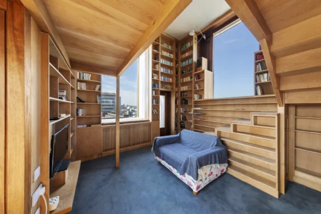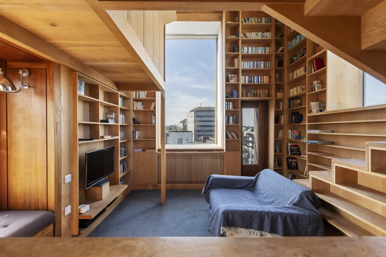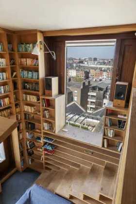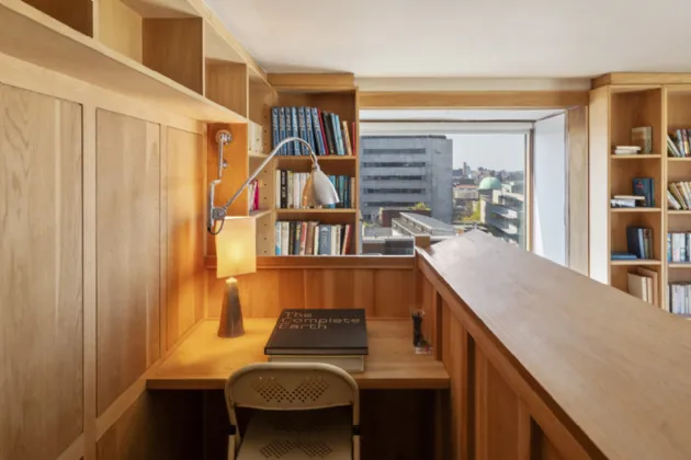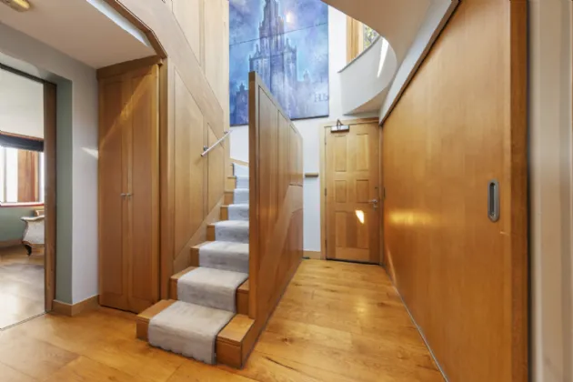 Library 4.092m x 3.819m An undeniably unique room atop the tower, the hand-crafted library is finished in American Oak, one of the most special 'work from home' spaces you will find in Dublin, complete with a 4.2m ceiling height. This charming room feels expansive yet cosy, with natural light pouring in from the large picture windows, benefiting from both a southerly and westerly aspect. A solid oak staircase rises and runs around to a mezzanine level with a desk at the end, while also providing access to the guest shower room.