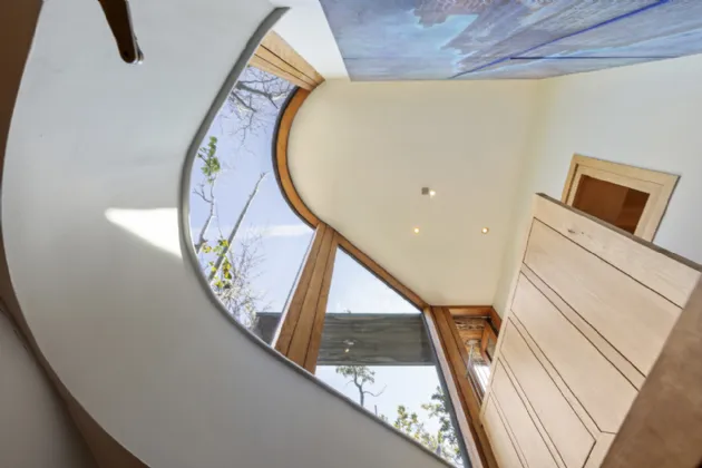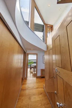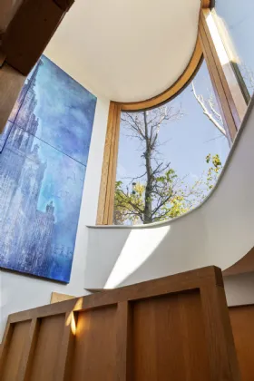 Landing Open to the entrance hall below, overlooking the private roof garden through the curved glazing, leading to the library.