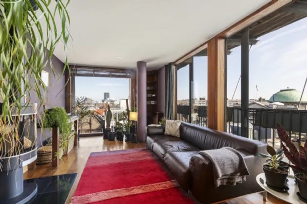 Upon entering no.17, you’re greeted by a dramatic double-height entrance hall with an impressive, curved glass wall above setting the scene for what is to come. The main living accommodation is at hall level and spans the full width of the apartment taking in 270-degree views across the rooftops of the city, benefiting from natural light from the southerly sun throughout the day. The open-plan living space, complete with Scandinavian glazed wood-burning stove, has the option of closing off rooms with a sliding door for more intimate spaces when needed. Both the living room and dining room offer wonderful views of City Hall and Dublin Castle, with a neat balcony accessed from the dining room running along the south side of the apartment. The kitchen is positioned off the dining room and benefits from a southerly and westerly aspect.
