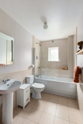 Bathroom 3.20m x 1.70m Comprising bath with shower off, Wc, wash hand basin, shelving, partly tiled walls and tiled floor.