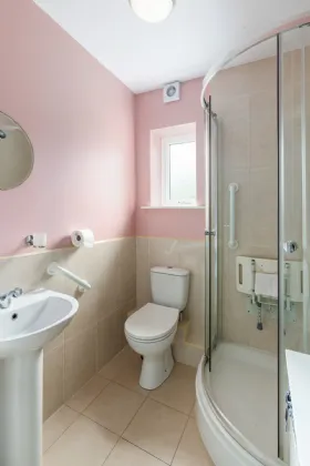 En suite 1.9m x 1.7m Comprising large walk in shower, Wc, wash hand basin, Prtly tiled walls, tiled floor.