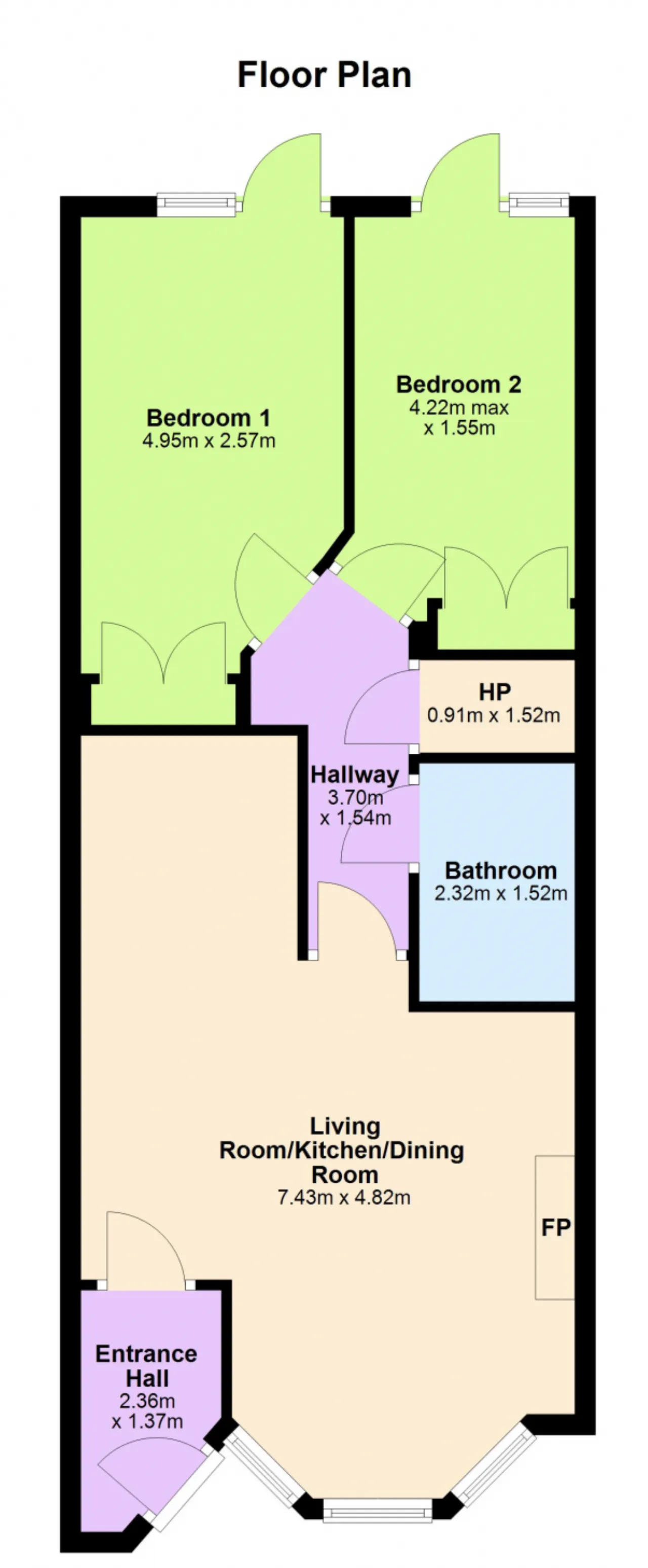 Living Room / Kitchen / Dining Room 7.43m x 4.82m With large feature bay window, fireplace and timber flooring. Kitchenette; fully equipped with ample wall & floor units. Appliances included in sale.