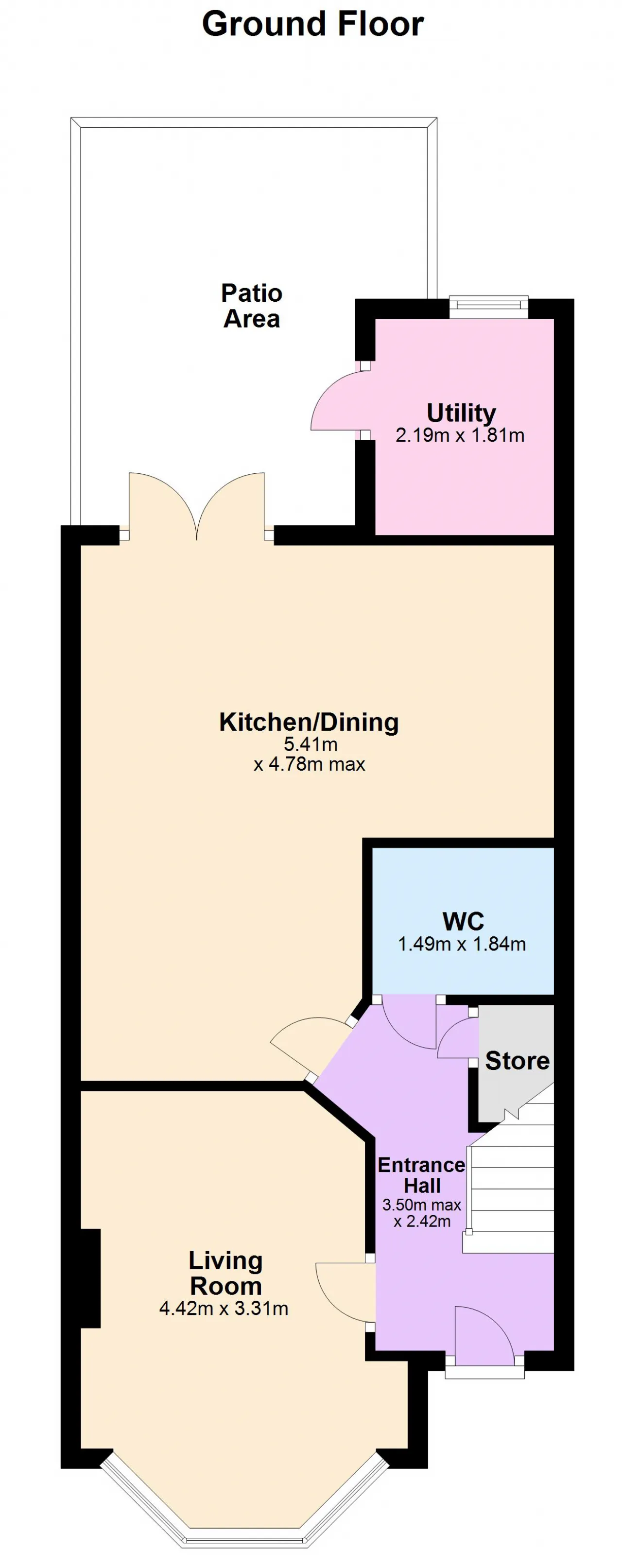 Kitchen/Dining 5.41m x 4.78m With bespoke contemporary fitted kitchen with ample wall & floor units. Electrical appliances included in sale. Double French doors open onto patio terrace.