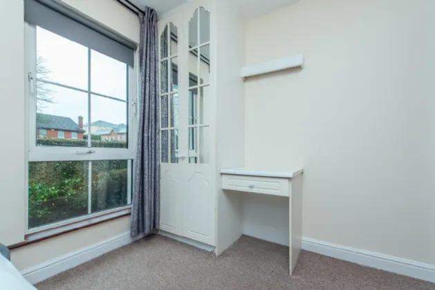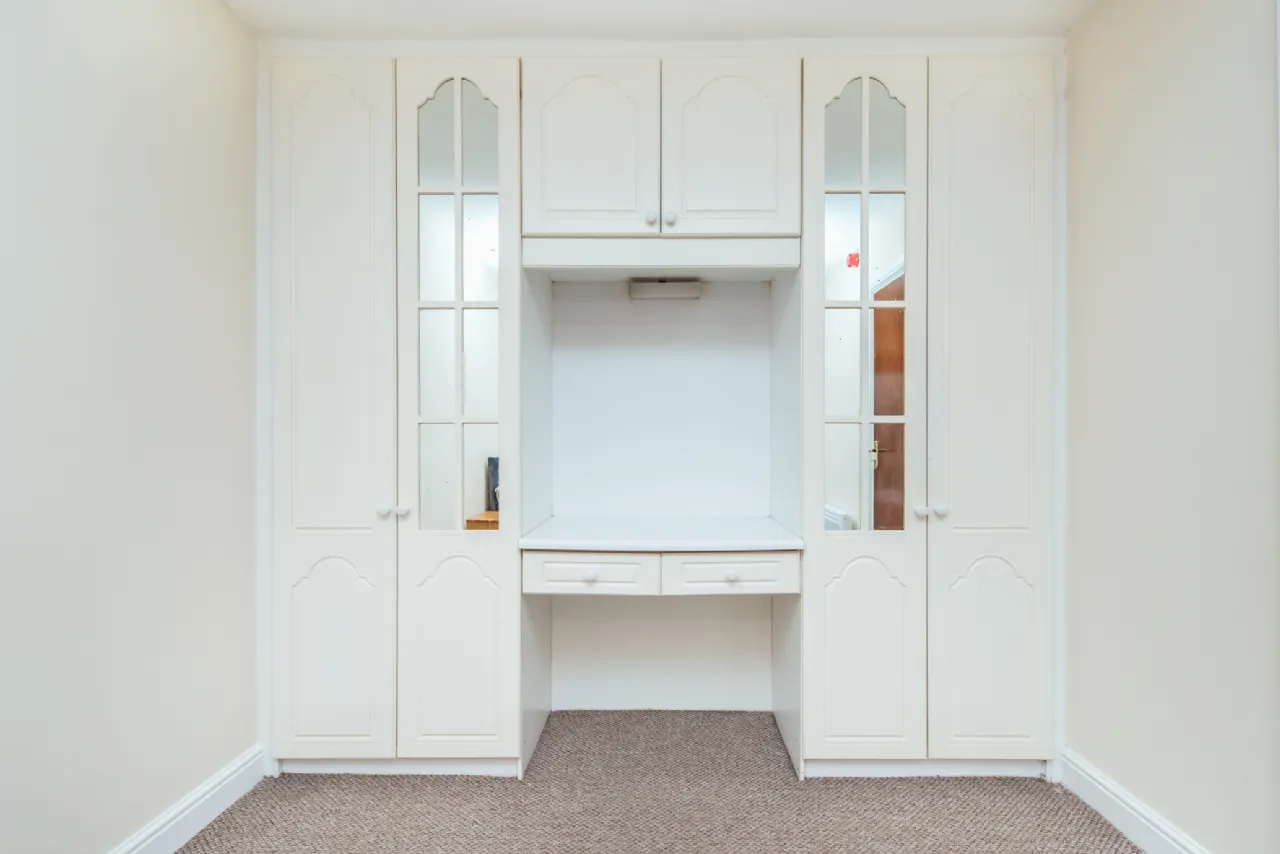 Bedroom 2 2.477m x 2.21m A double bedroom with front view, it has a fitted wardrobe and dressing table and carpet to floor.