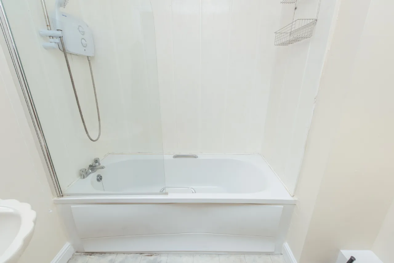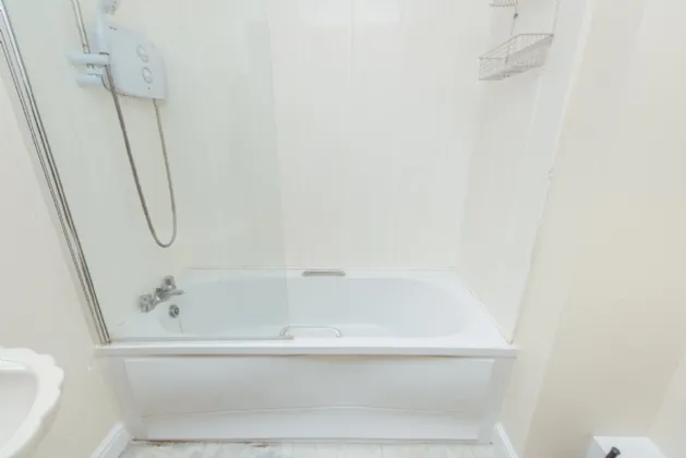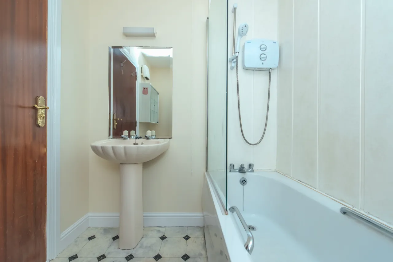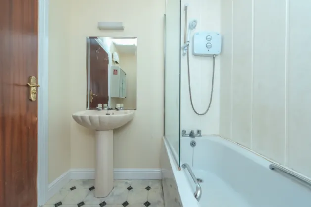 Bathroom 2.13m x 1.8m The bathroom includes wc, wash hand basin and bath with electric shower. With a linoleum floor, extractor and fan heater.