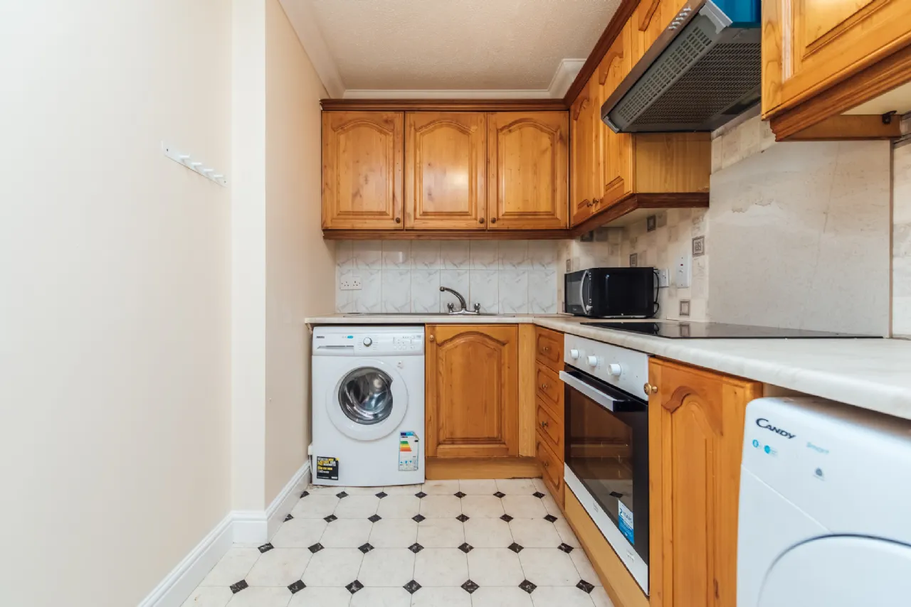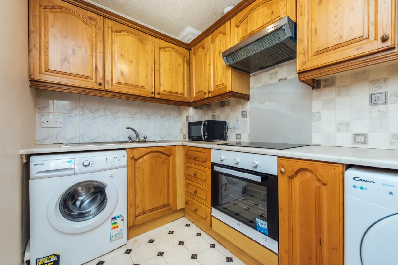 Kitchen 2.6m x 1.95m The kitchen offers a range of pine cabinets and drawers with a tiled splashback and linoleum floor. It includes oven and ceramic hob, fridge freezer, tumble dryer and washing machine.