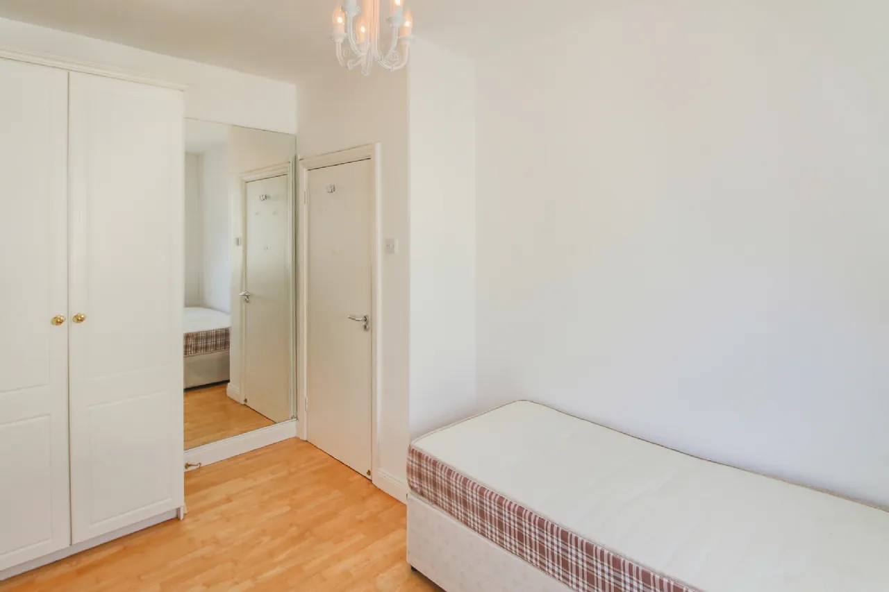 Bedroom 2 10.50m2 Wood flooring, built-in wardrobes, Dimplex electric heater, wall mirror, curtain pole & drapes x2.