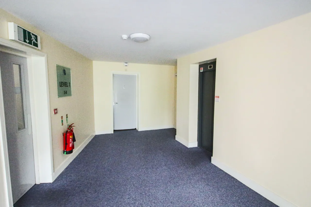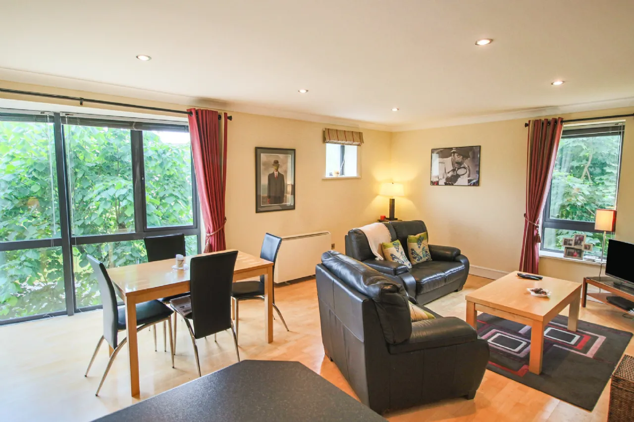 Kitchen/Living/Dining Room 33m2 Extensive floor to ceiling window feature, fitted kitchen units, Candy electric oven & hob, extractor fan, Candy washer dryer, Candy under counter fridge. Curtain pole & drapes x2, window blinds x3, recessed down lights, electric fireplace with wood surround, Dimplex storage heater.