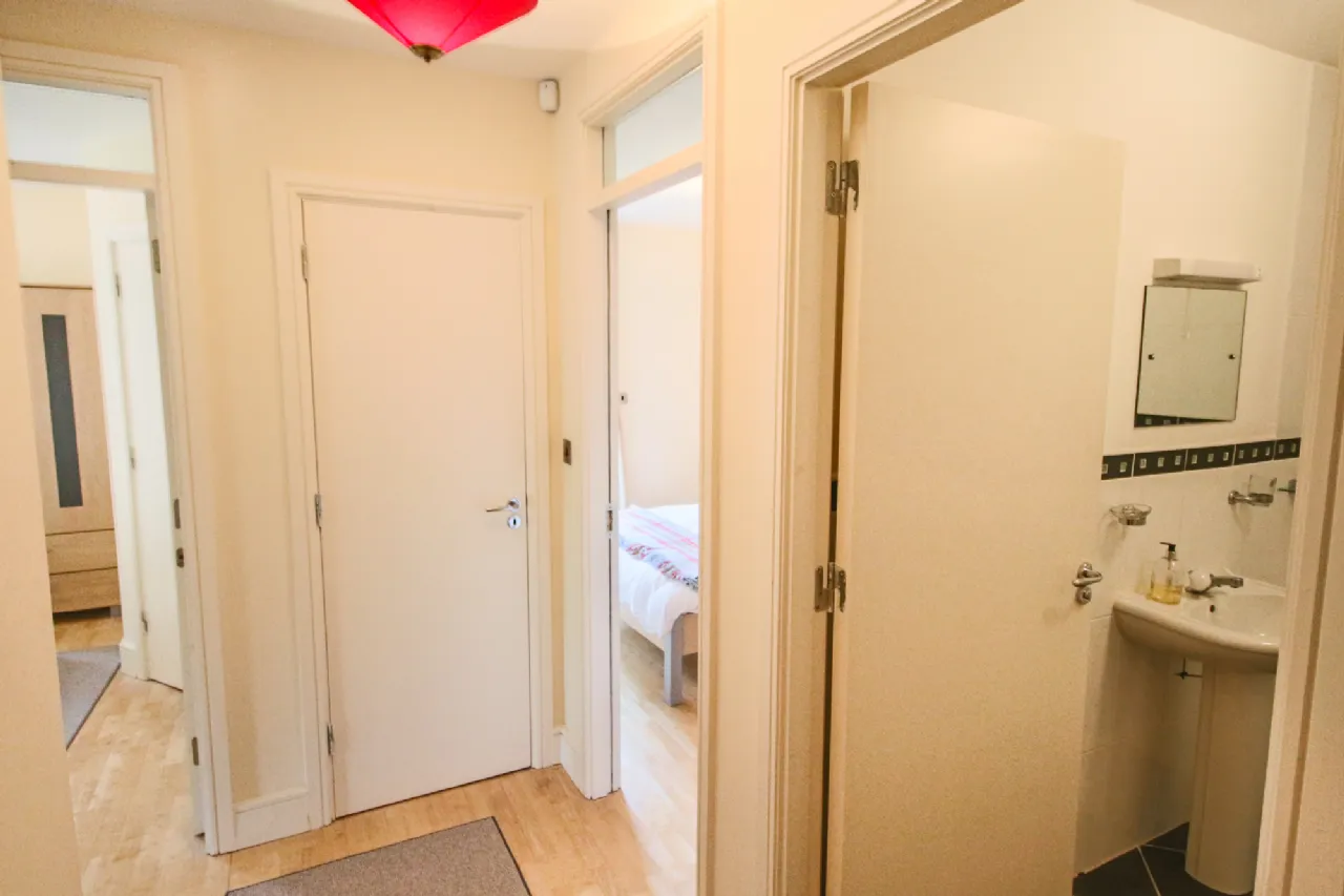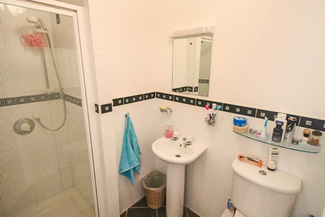 En-Suite Tiled, shower enclosure, Dimplex wall heater, extractor fan, shaver point & light, wc&whb.