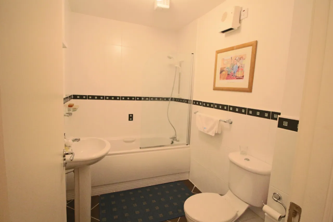 Bathroom 2.63m x 1.72m Tiled, bath with shower head, chrome towel rail, Dimplex wall heater, extractor fan, shaver point & light, wc & whb.