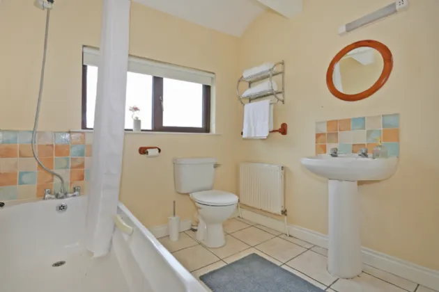 Bathroom With panelled bath and shower over, pedestal WHB and WC