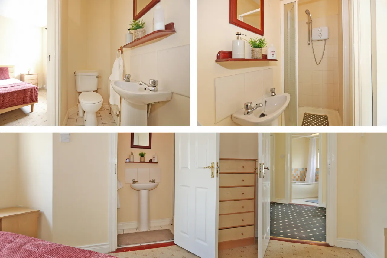 Ensuite With tiled shower cubicle, pedestal WHB with tiled splashback, WC and extractor