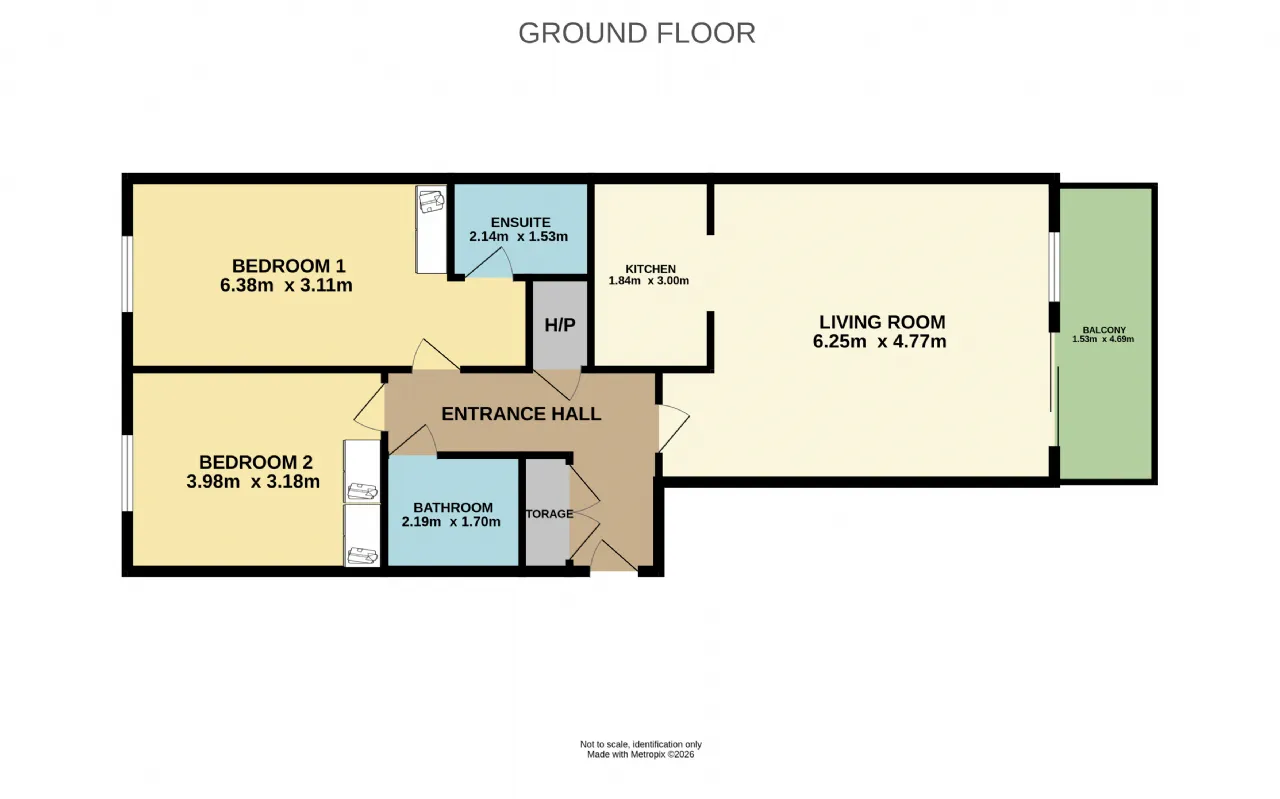 Entrance hall, living room, kitchen, two double bedrooms, ensuite main bedroom, guest bathroom, balcony.