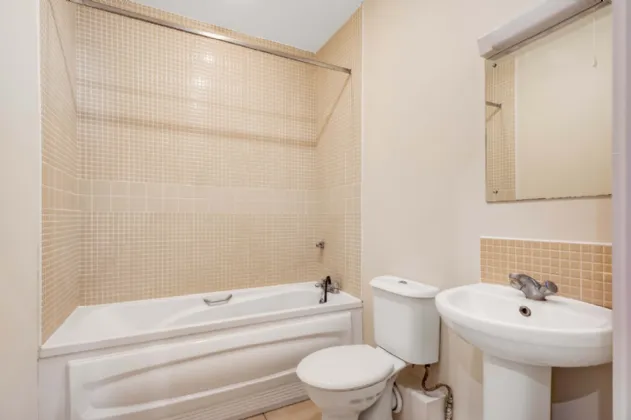Bathroom 3 -piece suite, tiled floor, tiled at bath and sink area,, mirror over sink