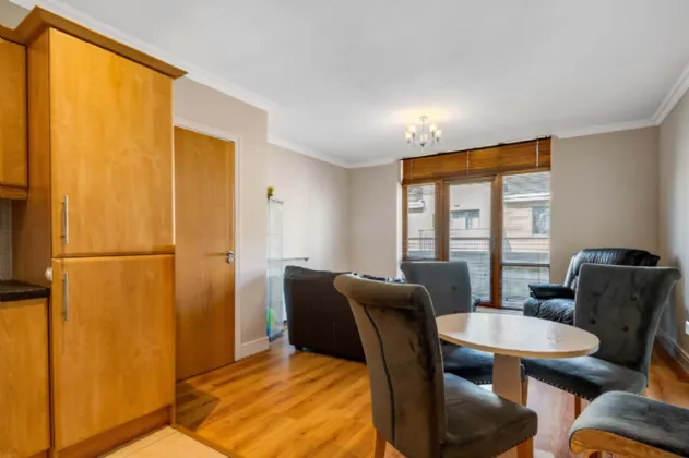 Dining/ Living Area Just off the kitchen, wood floor underfoot, Door to exterior balcony area