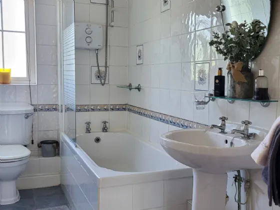Bathroom Three-piece suite, Triton T90z electric shower, recessed lighting, partly tiled walls and tiled floor. Extractor fan and window for good ventilation.