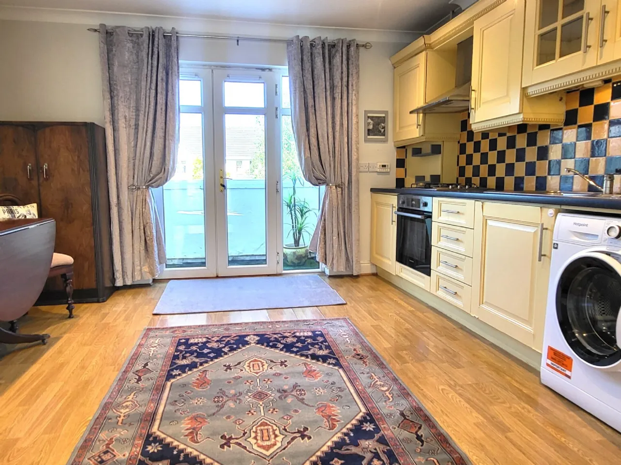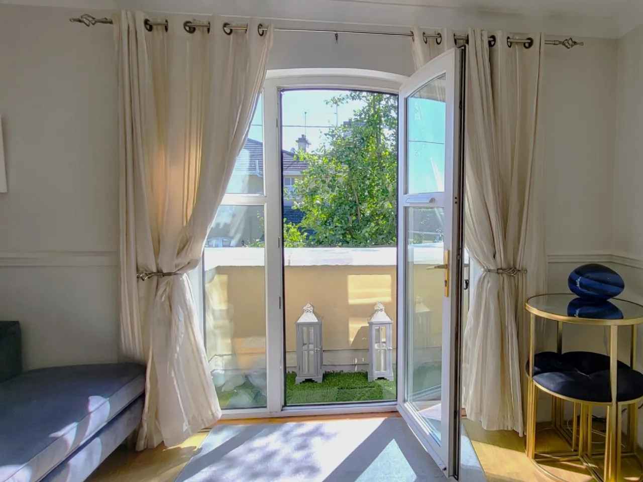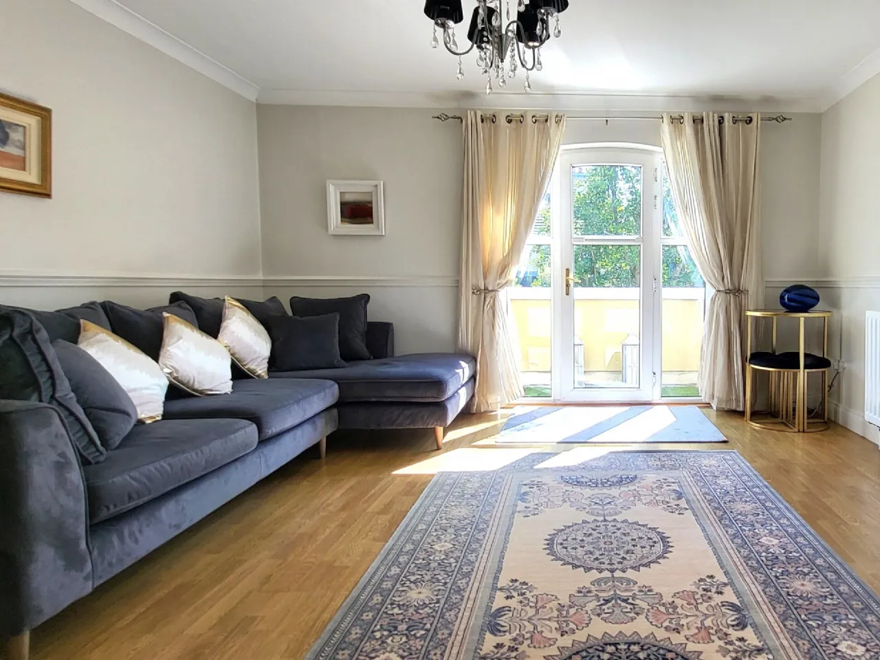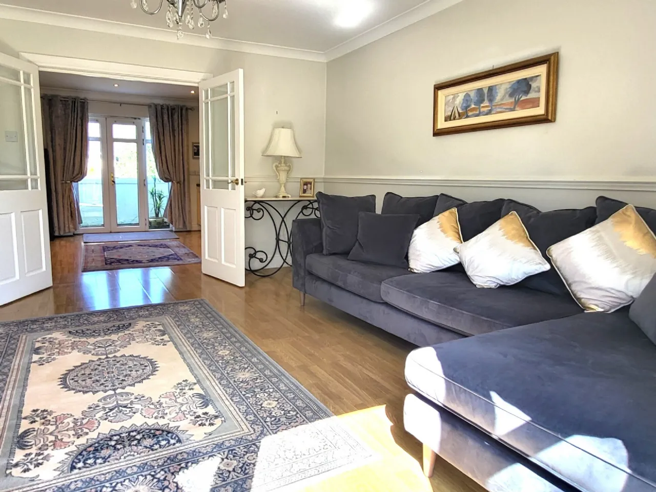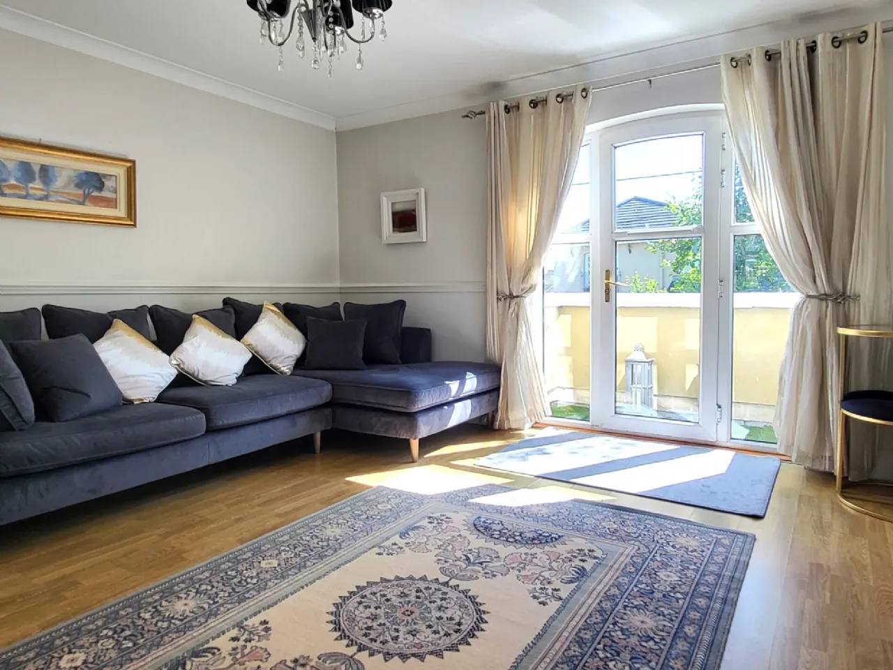 Living Room A bright spacious room with balcony off, coving, laminate flooring underfoot