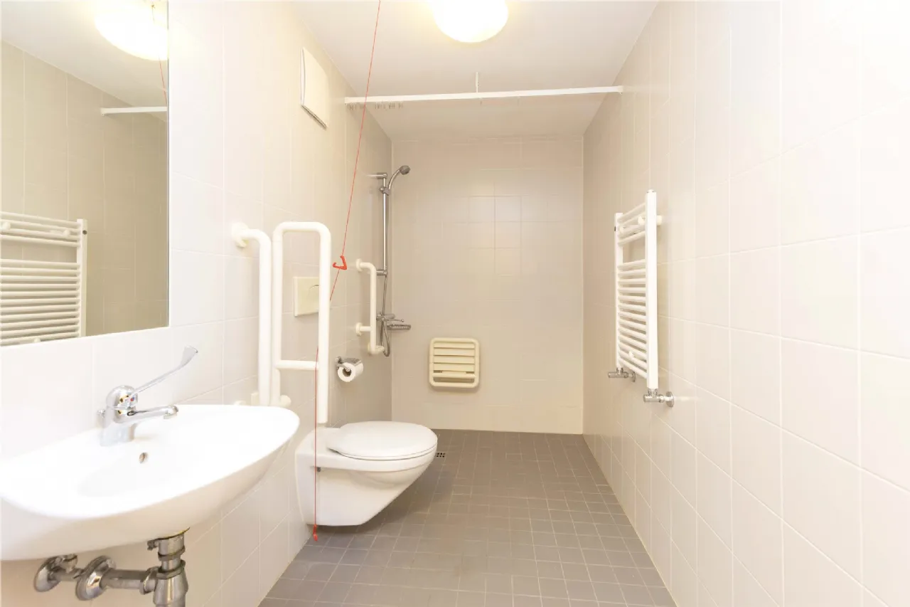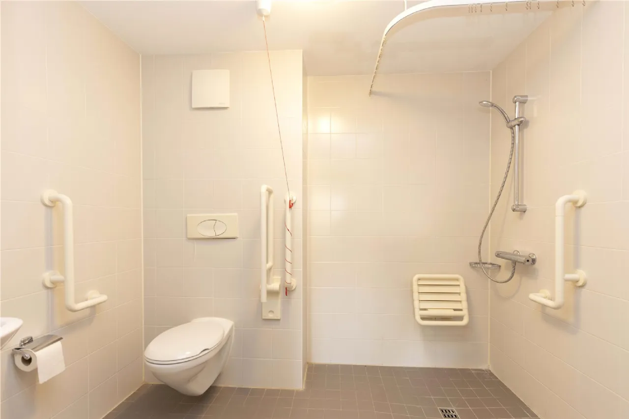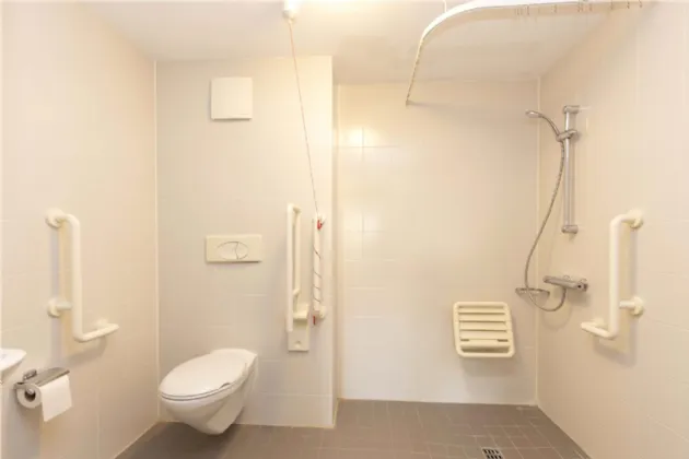 Bathroom Level access wet area with mains shower, heated towel rail, WC, wash hand basin, fully tiled walls and floor