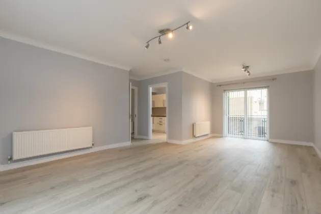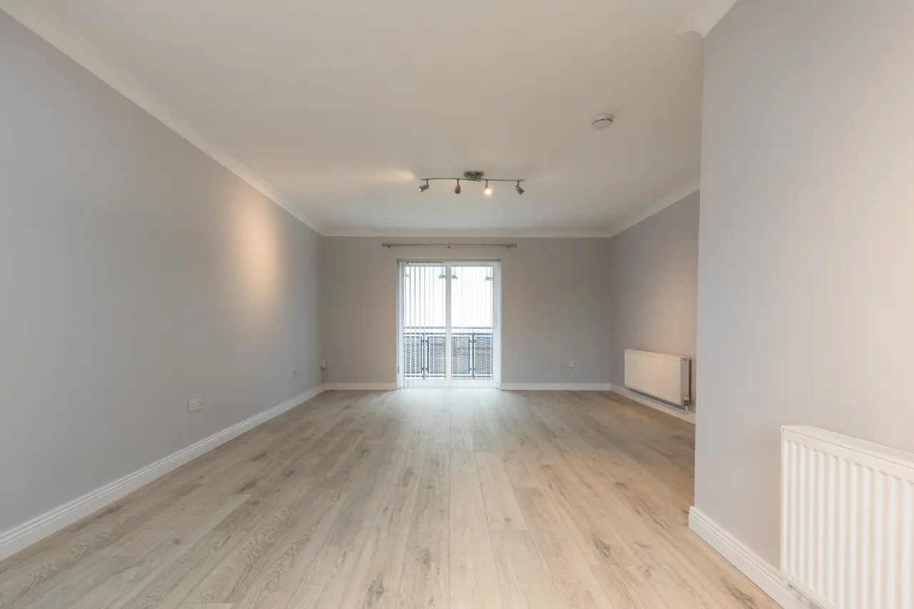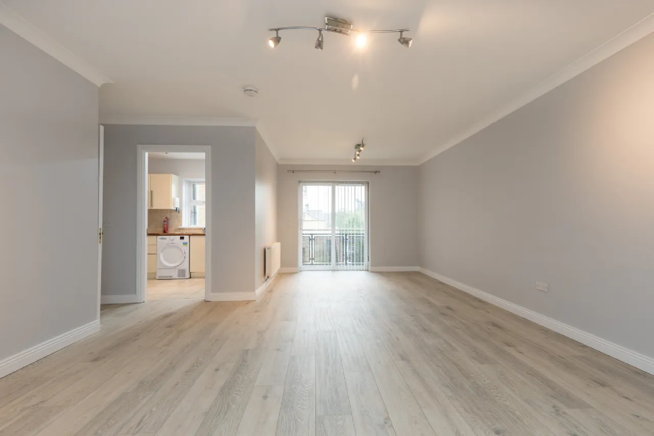 Dining/Living Room 5.32m x 7.17m at widest point, laminate wood flooring, sliding doors to both balconies.