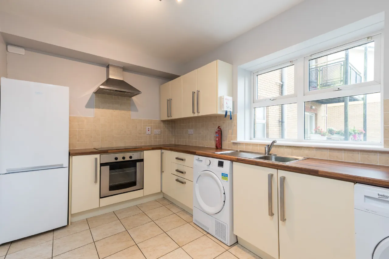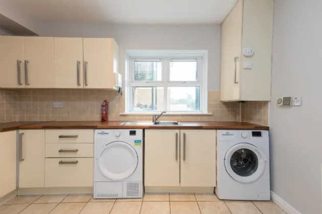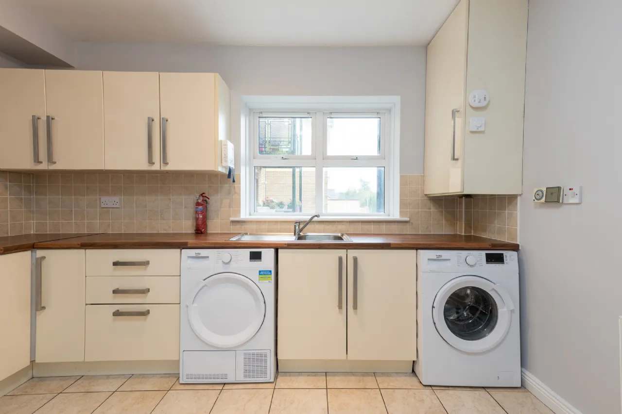 Kitchen Dining Room 3.33m x 2.49m tiled flooring and backsplash, fitted kitchen units, electric oven, electric hob, fridge freezer, washing machine and dryer.