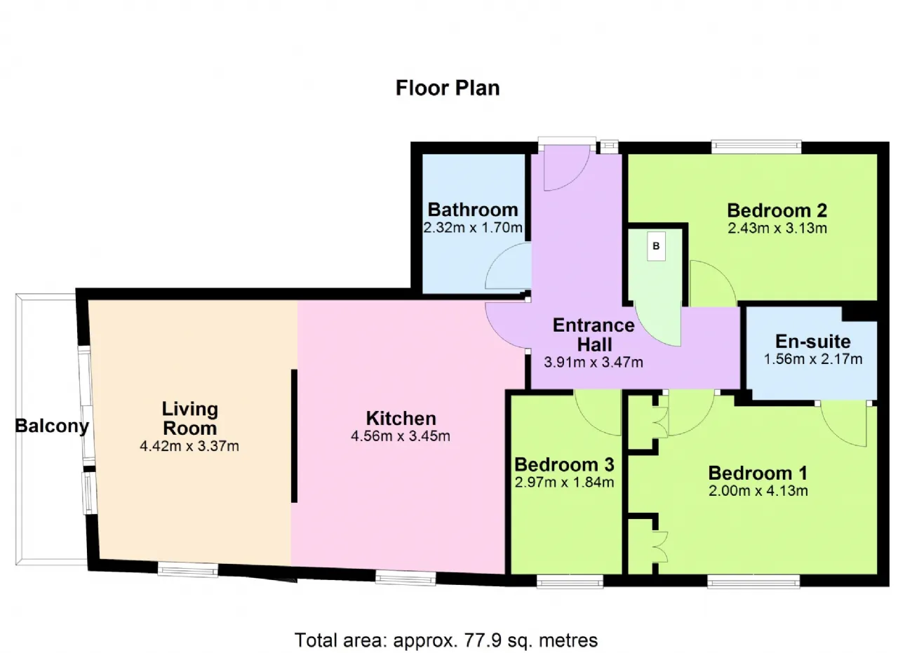 Open Plan Kitchen Living 8.98m x 6.82m Step into a spacious, dual-aspect open-plan kitchen and living room where natural light floods in from two directions, creating a bright and airy atmosphere throughout the day. The heart of the room is the sleek contemporary kitchen, paired with minimalist hardware and integrated appliances for a clean, streamlined look. A moveable kitchen island stands at the centre, offering flexibility for entertaining or food prep. Flowing naturally from the kitchen, the living area is centred around a striking fireplace wall, while glazed doors provide direct access to a private balcony, perfect for morning coffee or evening relaxation.