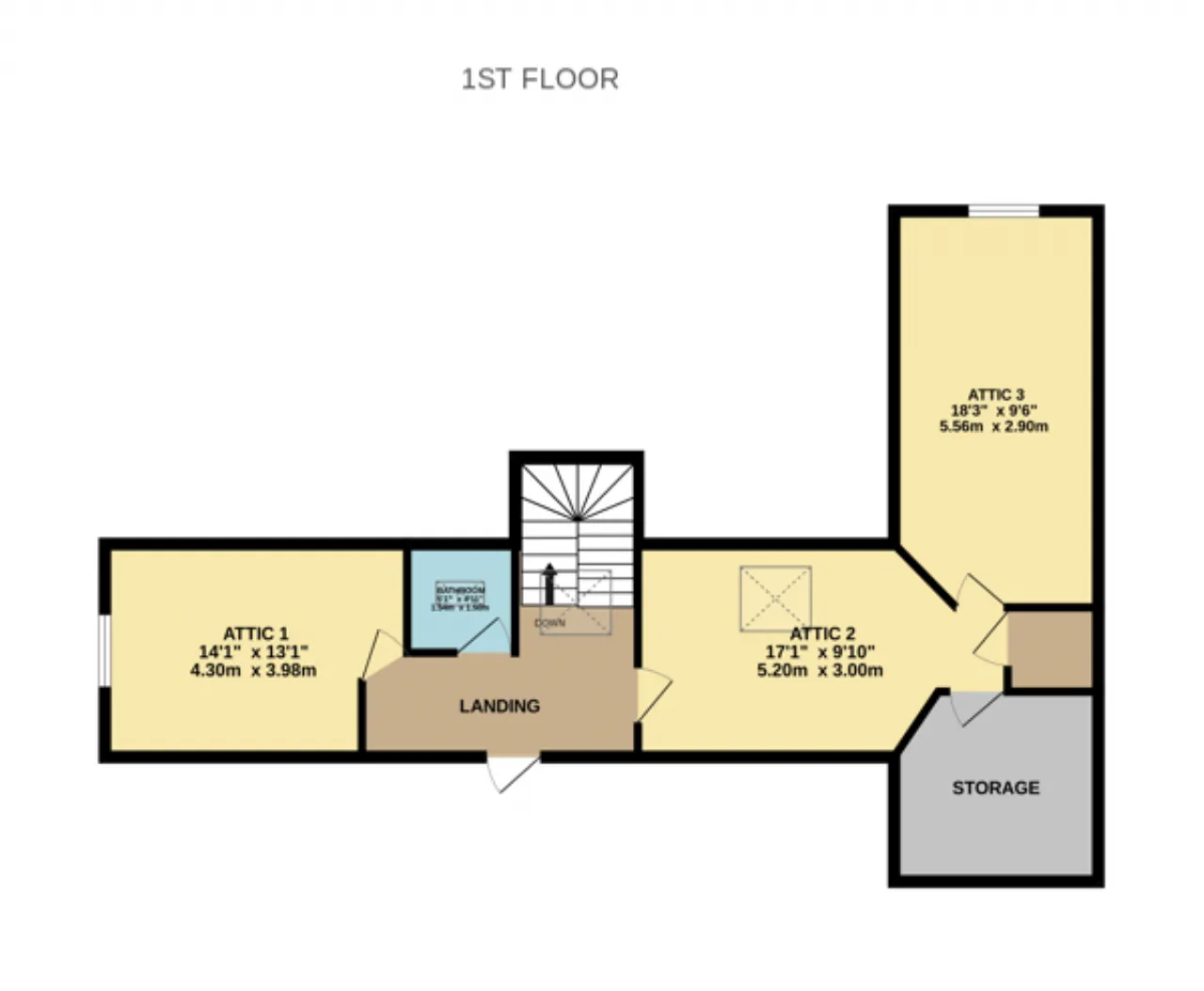 Attic Large space, currently separated into three different spaces with shower room and storage room.