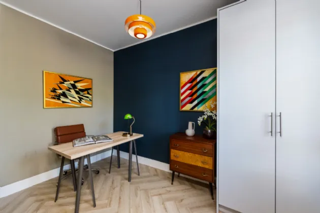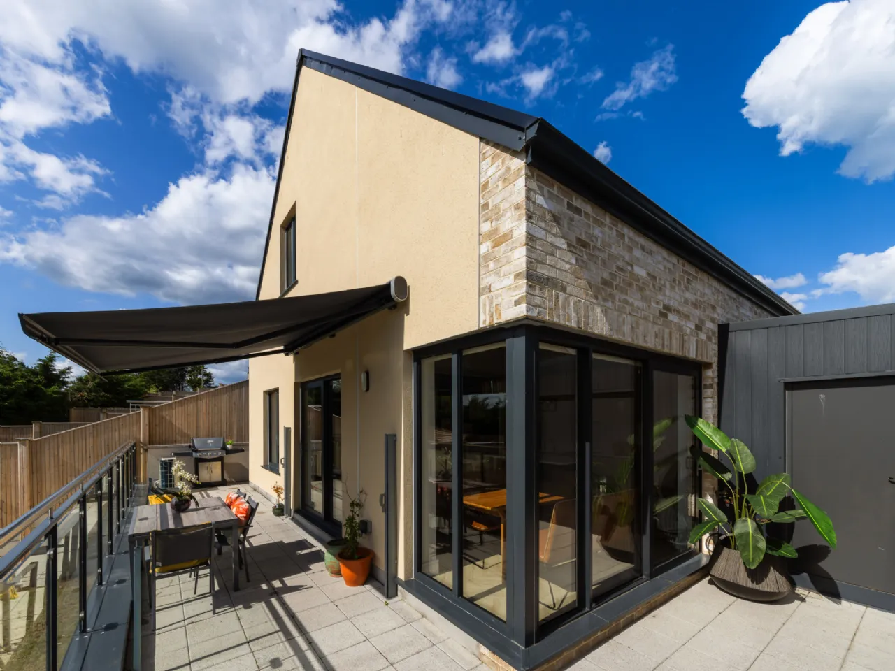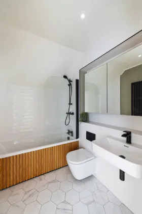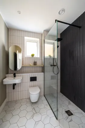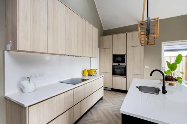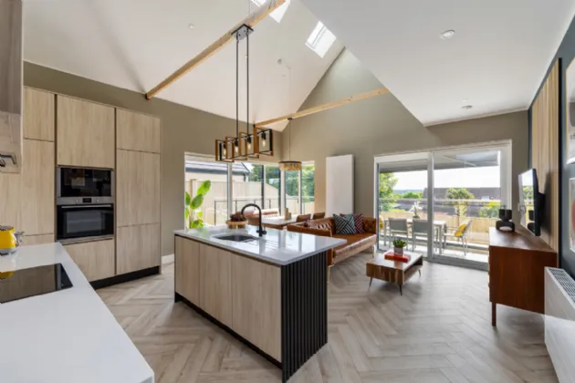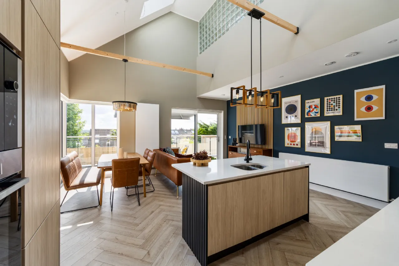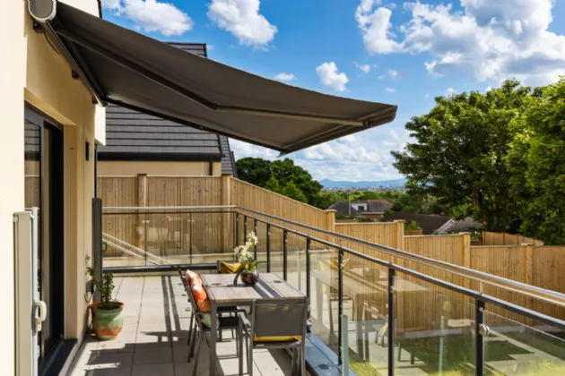 Designed with elegance and practicality, this quality home extends to 147 sq.m /1,582 sq.ft. approx. and enjoys panoramic views of the Dublin mountains. On the ground level, the thoughtfully designed layout begins with a grand entrance lobby providing a contemporary guest bathroom. To the rear of the property, a generous mezzanine style kitchen/living area boasting stylish Kitchen fittings with quality Quartz worktops and double ceiling height with exposed wooden beams. The large sliding doors flood the living quarters with light and provide seamless access to indoor-outdoor living, leading to the sunny South/West facing raised patio with mechanical awning. A secondary lounge sits to the front of the property overlooking the quiet, private avenue.