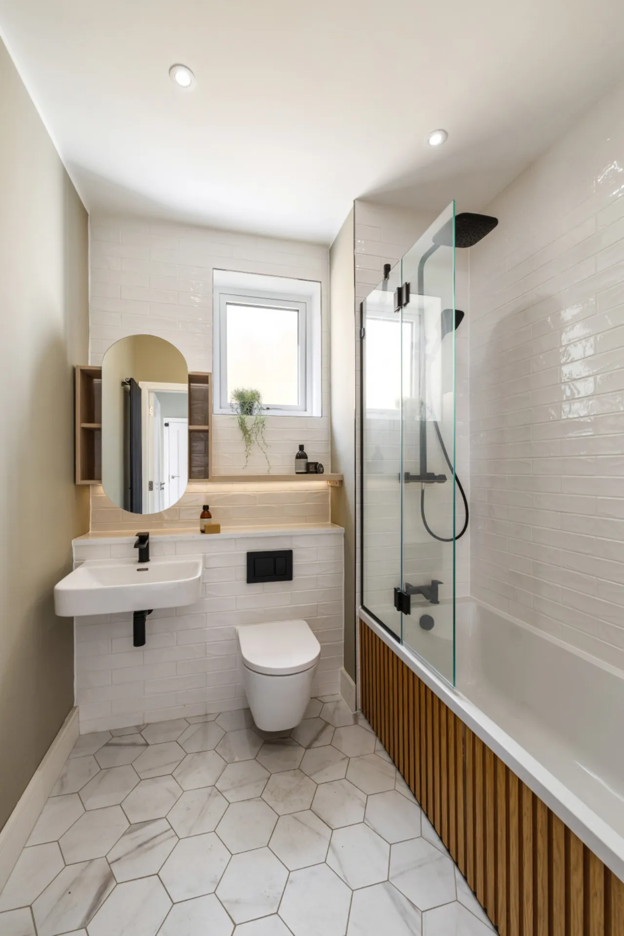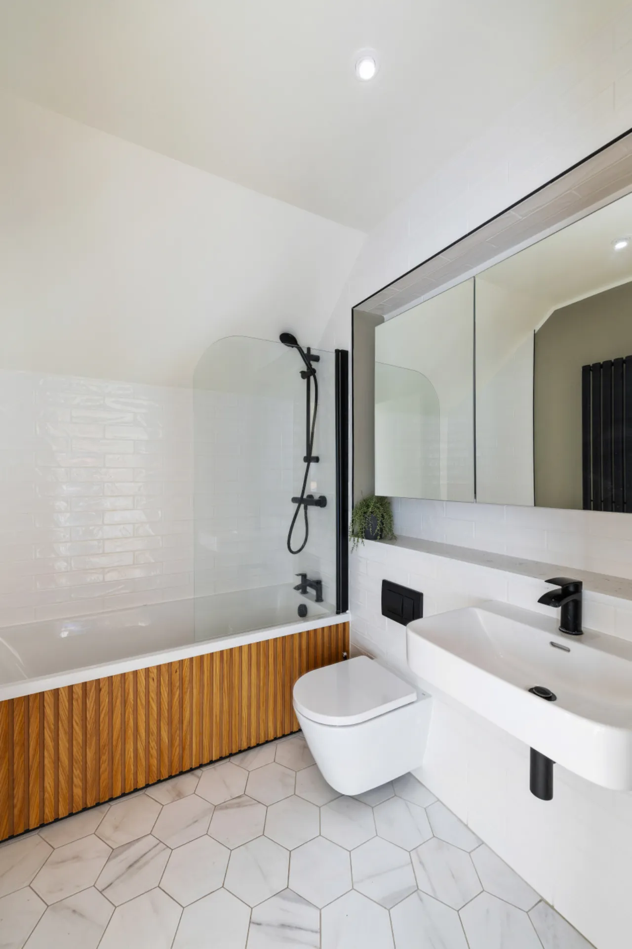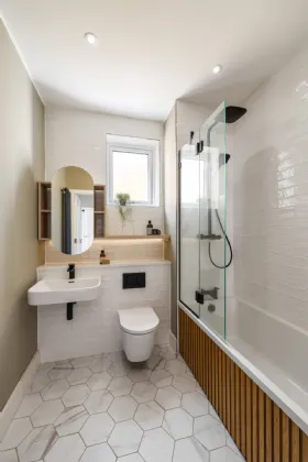 Guest Bathroom 1.87m x 2.08m Wc, w.h.b., bath, mirrored cabinet, heated towel rail, tile flooring and part-tiled walls