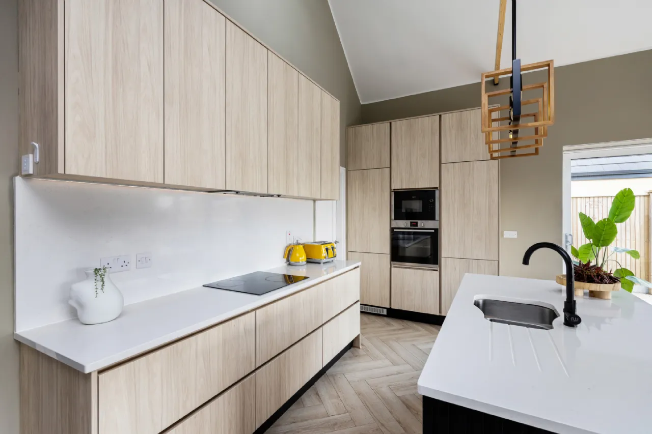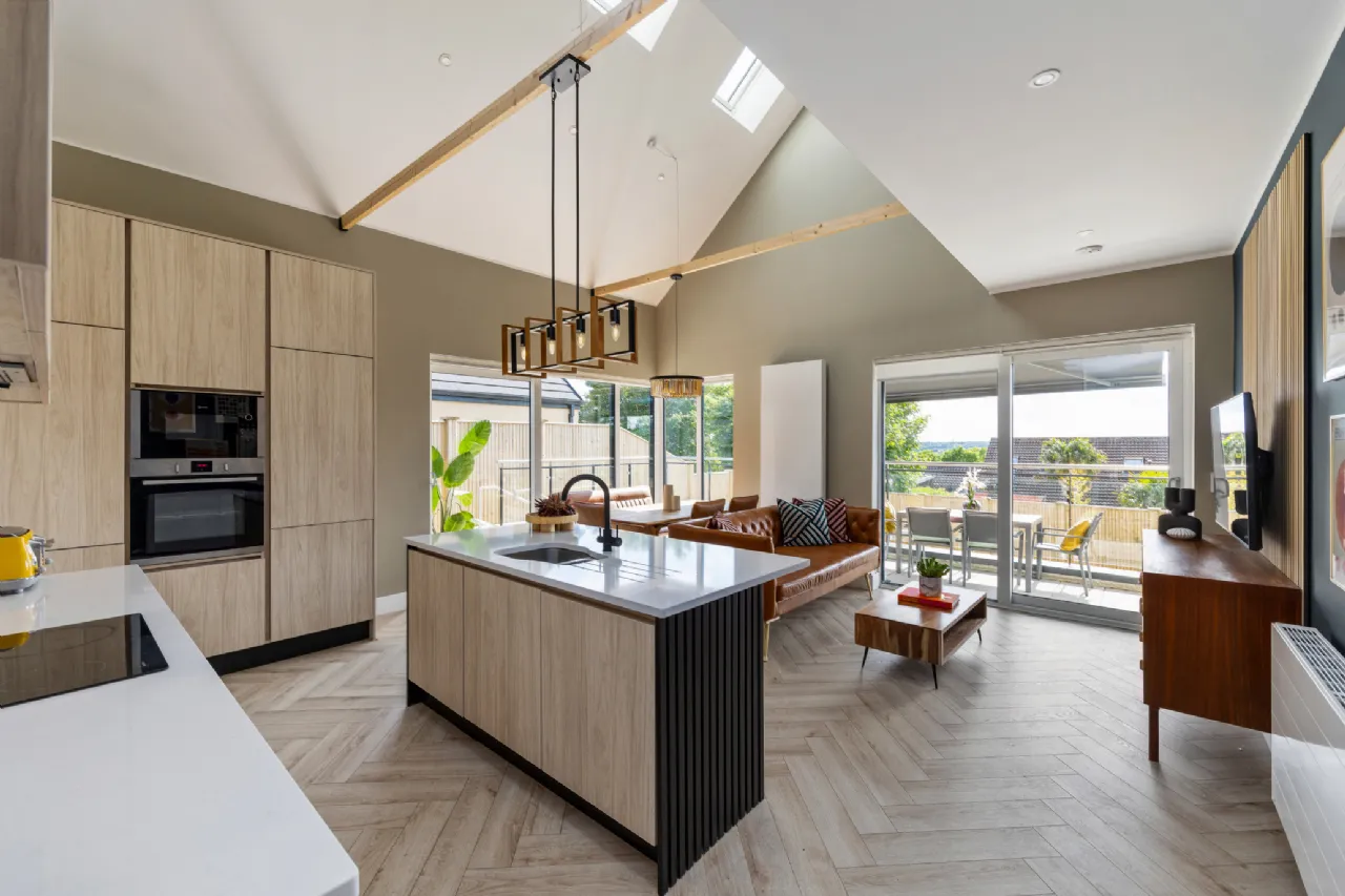 Kitchen/Living area 5.55m x 5.19m Stylish Kitchen with full height cabinetry and built in appliances, quartz countertops, Kitchen Island and Laminate wood herringbone flooring.