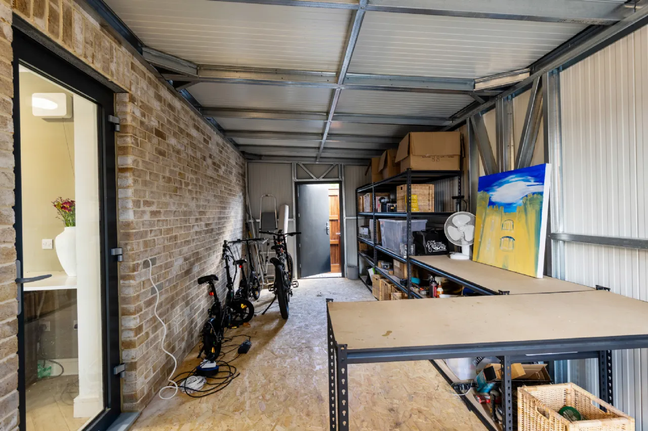 The property includes three generously sized bedrooms, with the main bedroom a luxurious ground-floor ensuite. The upper mezzanine level has been sealed with glass brick to add privacy to the living area while preserving natural light. A first-floor family bathroom with bathtub completes the floorplan.