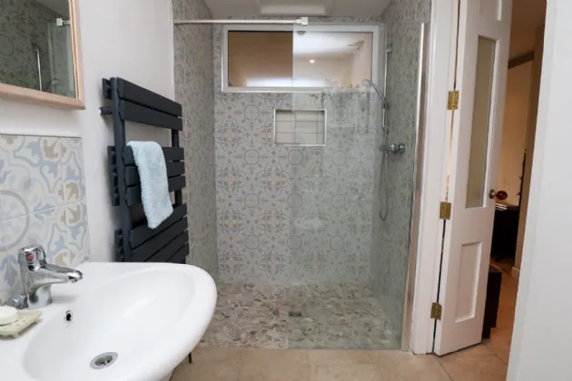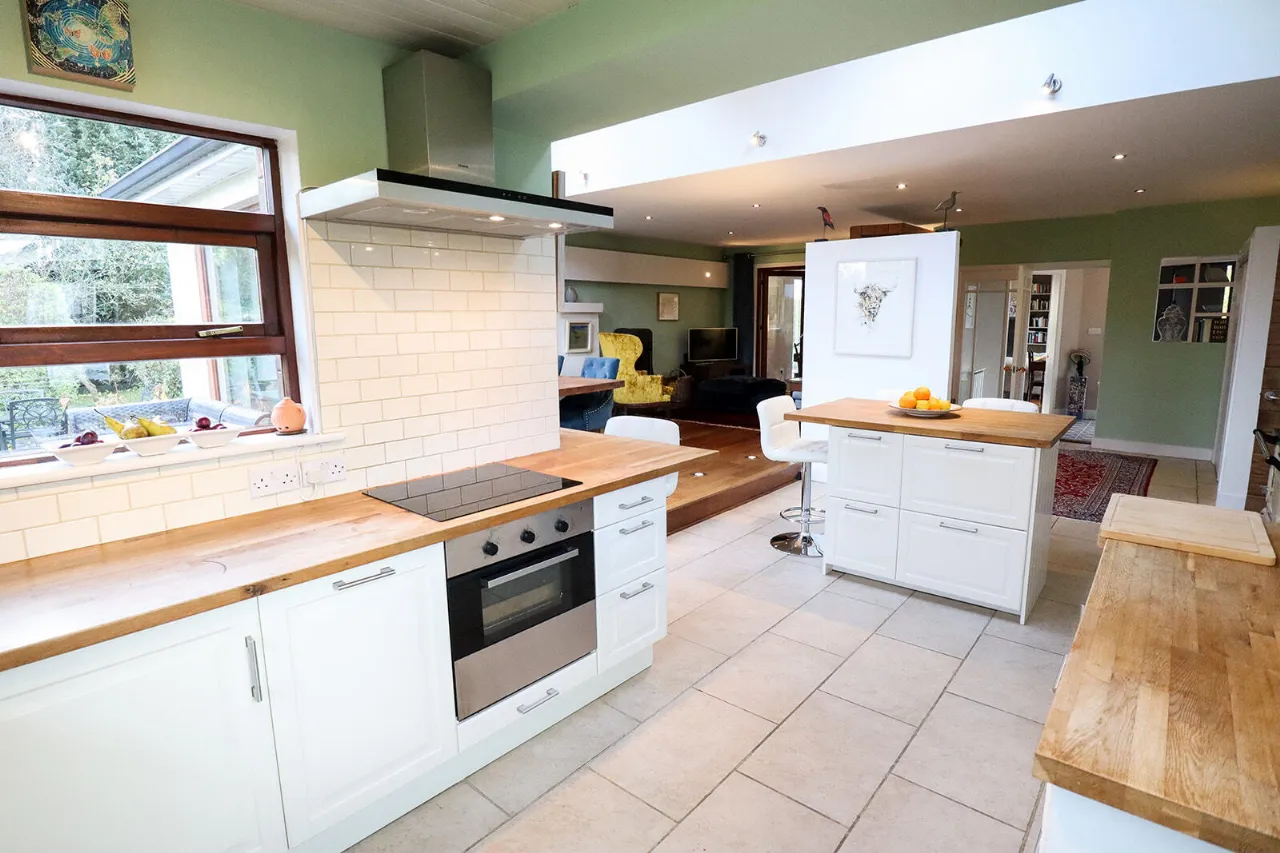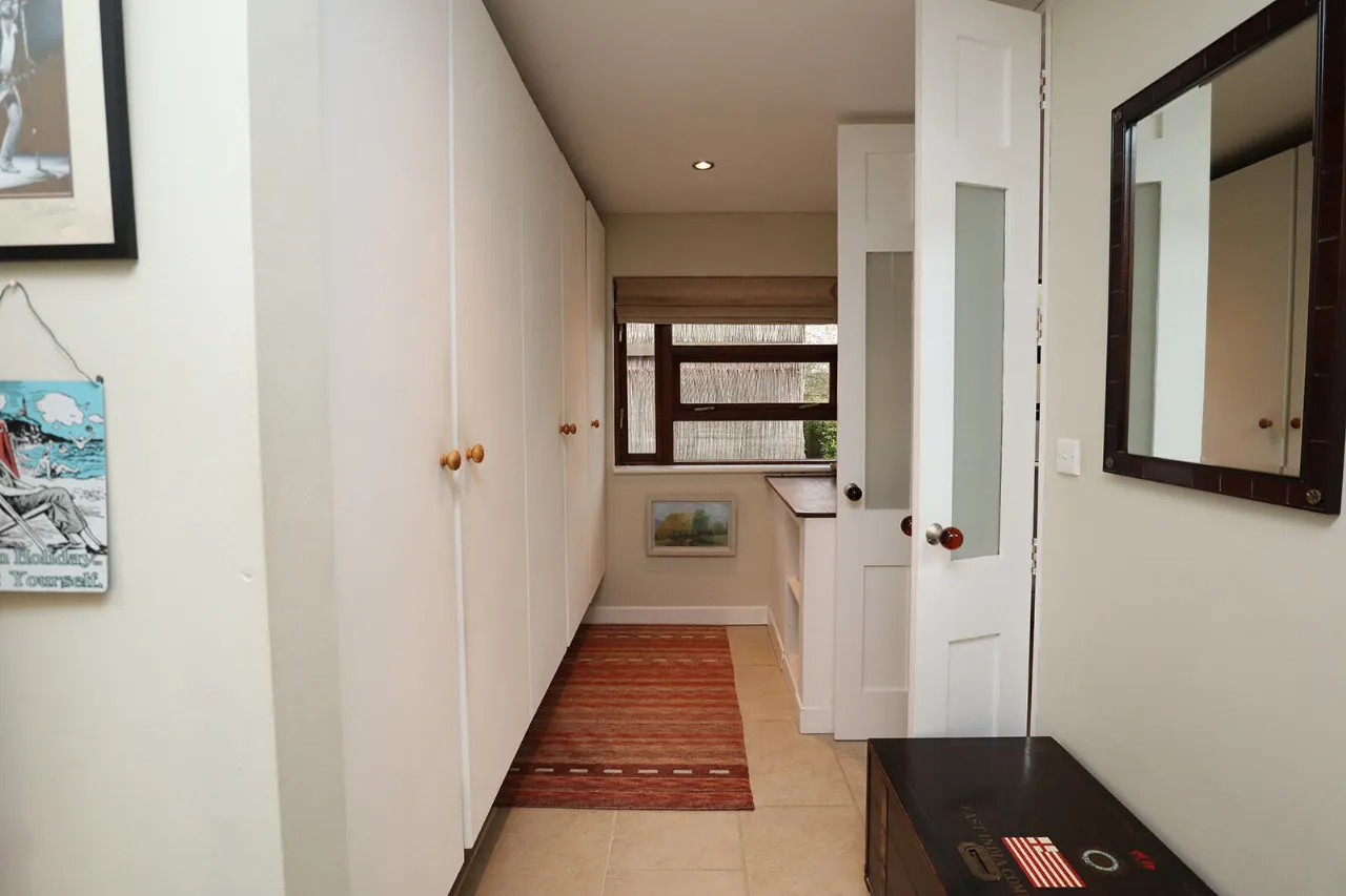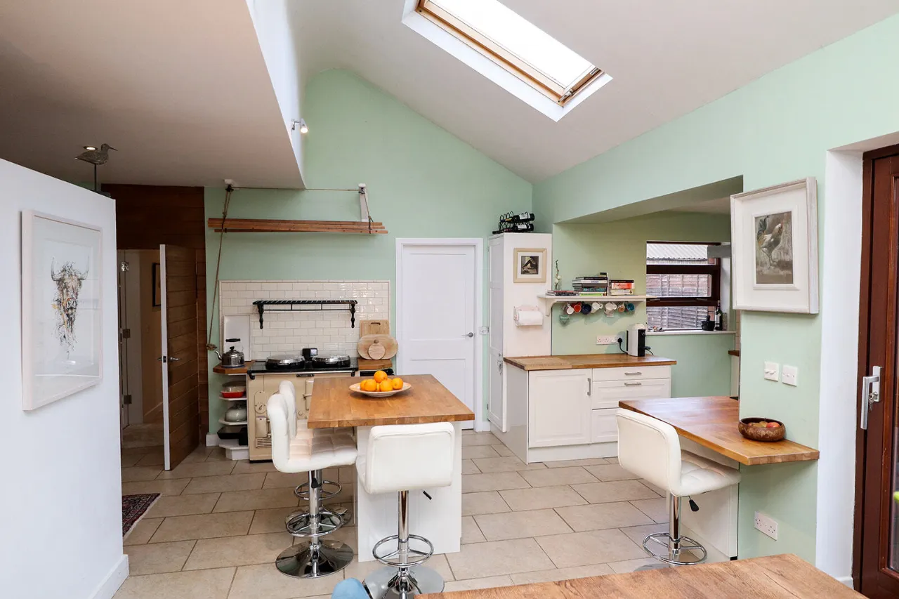 Kitchen / Dining / Living Room 7.42m x 7.52m + 2.71m x 2.70m Expansive L-shaped open plan room with lovely views of the rear garden. The living area is fitted with a wood-burning stove. Solid Teak tongue and groove floorboards continue through to the dining area. The dining area can accommodate a large table and chairs for family dining and formal entertaining. Vaulted ceiling fitted with two south-east facing Velux windows fitted in the roof to the rear. A super-sized sliding patio door gives access out to a decked patio area and rear garden. The kitchen area is fitted with cream coloured country-style wall and floor units, wooden countertops, Belfast sink and tiled backsplash. Zanussi electric oven and four-ring induction hob. Siemens extractor hood. Ikea integrated dishwasher. Centre island with underneath storage and space for three bar stools. A reconditioned oil-fired Aga range cooker is the main focal point of the kitchen/dining/family room. Fitted coat cupboard with sliding doors. Tiled floor throughout the kitchen.