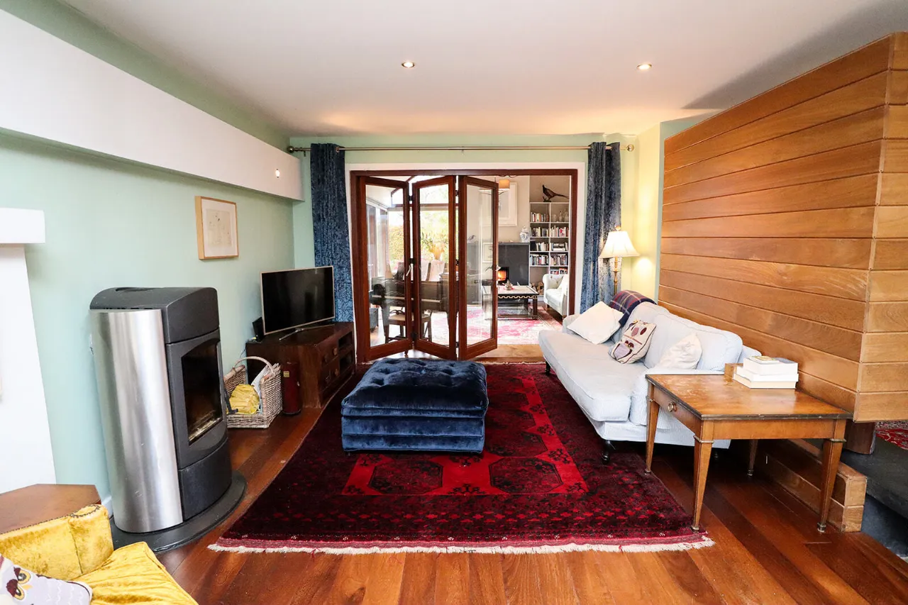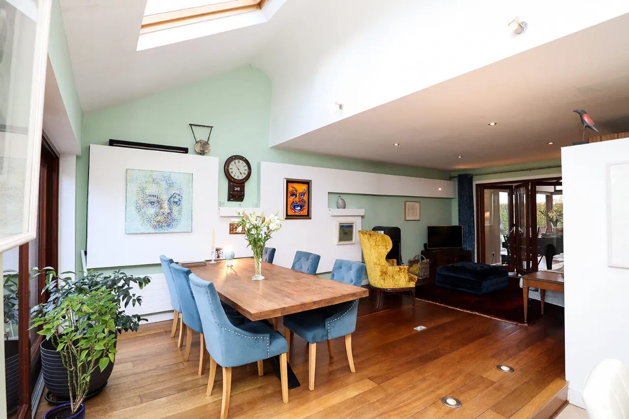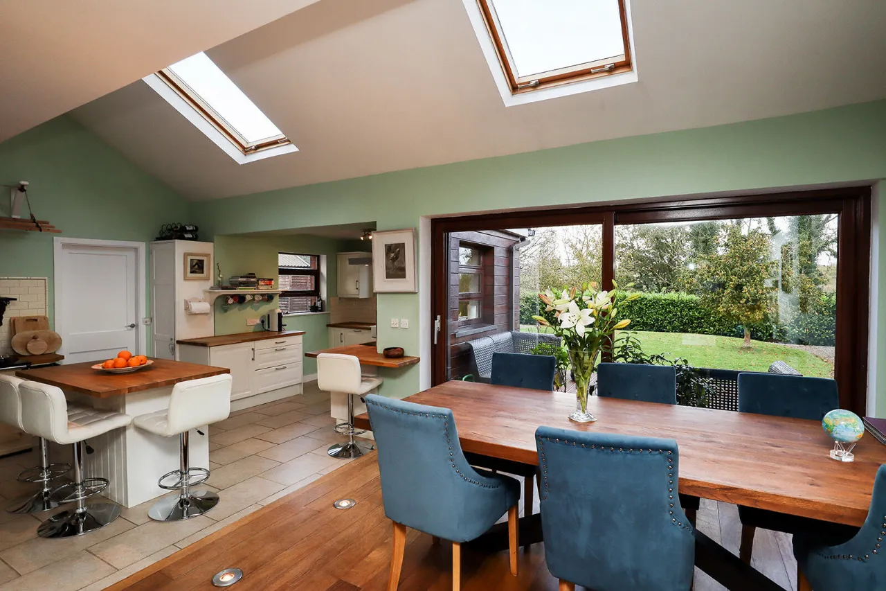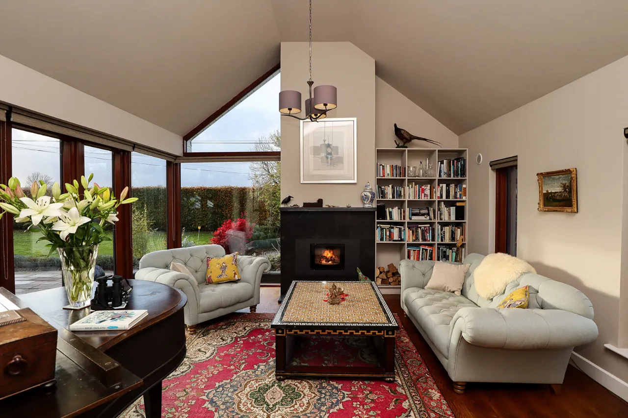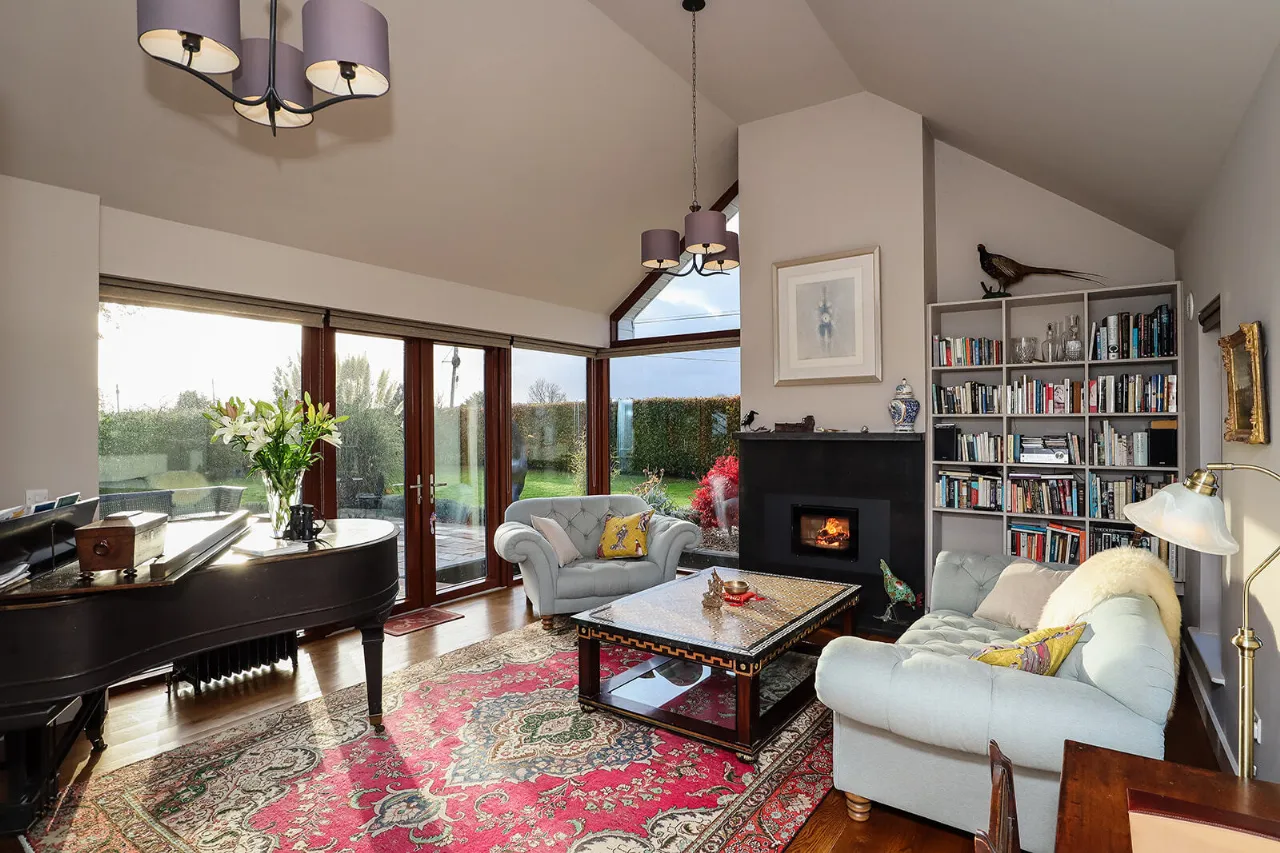 Sitting Room 4.81m x 6.60m Exceptionally large and sun-drenched triple aspect room with impressive views of the front and side gardens. Feature vaulted ceiling with floor to ceiling angled corner window. French doors with large glass side panels open out to sun-drenched patio area. Kilkenny Limestone fireplace fitted with a recessed Stovax wood burning stove. Built-in bookcases in the alcove to the right of the fireplace. Solid Oak wide plank flooring and three cast-iron radiators. Glass panel folding doors open through to the kitchen/dining/living room. Access to overhead storage in the roof.