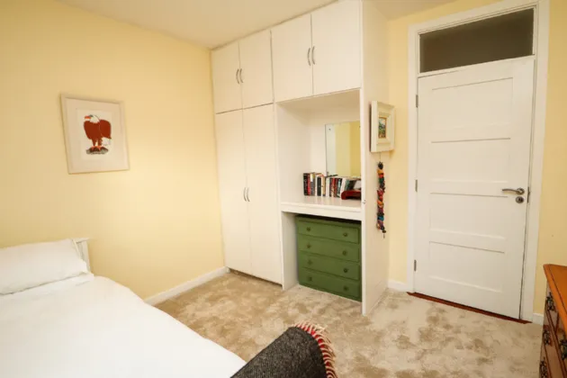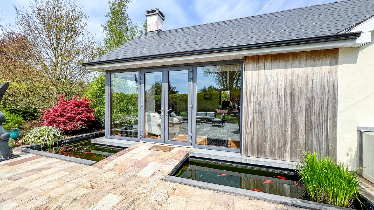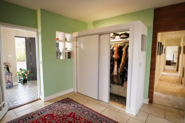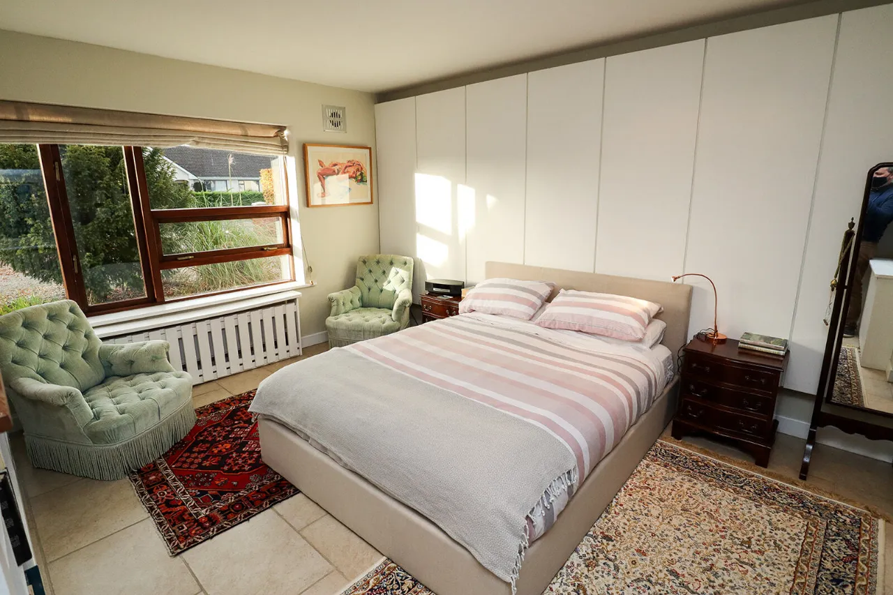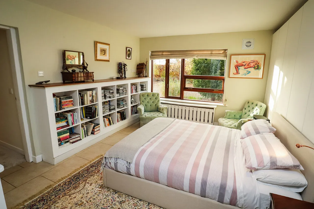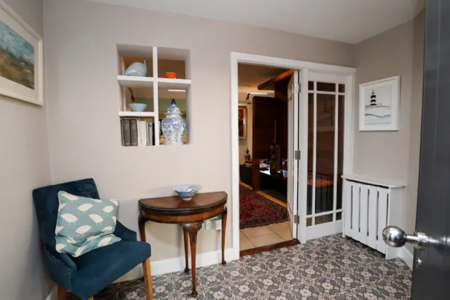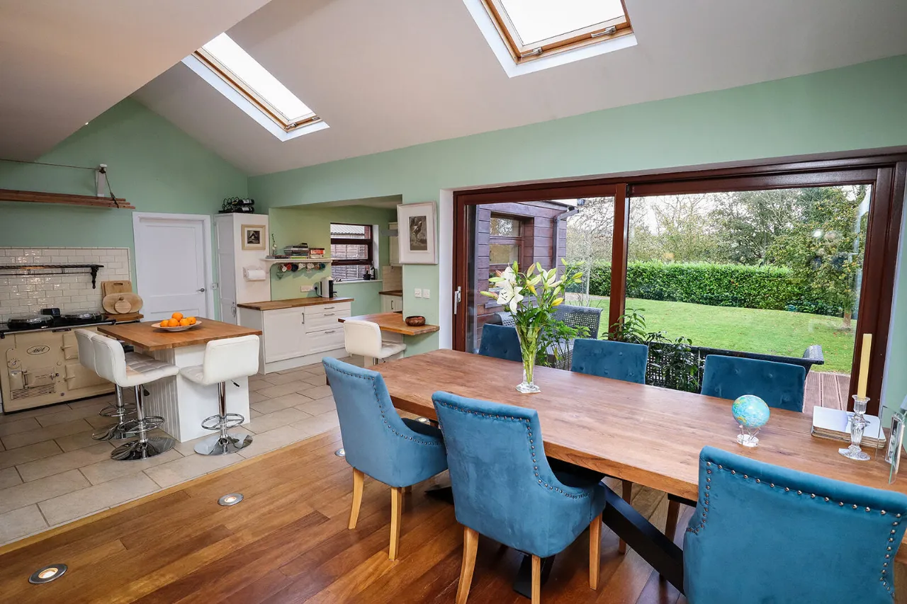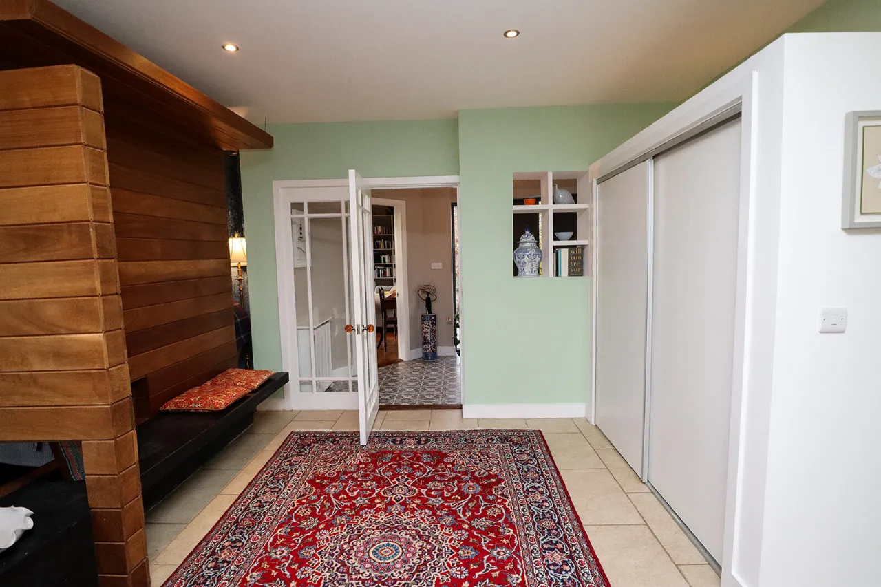Sitting Room 4.81m x 6.60m Exceptionally large and sun-drenched triple aspect room with impressive views of the front and side gardens. Feature vaulted ceiling with floor to ceiling angled corner window. French doors with large glass side panels open out to sun-drenched patio area. Kilkenny Limestone fireplace fitted with a recessed Stovax wood burning stove. Built-in bookcases in the alcove to the right of the fireplace. Solid Oak wide plank flooring and three cast-iron radiators. Glass panel folding doors open through to the kitchen/dining/living room. Access to overhead storage in the roof.