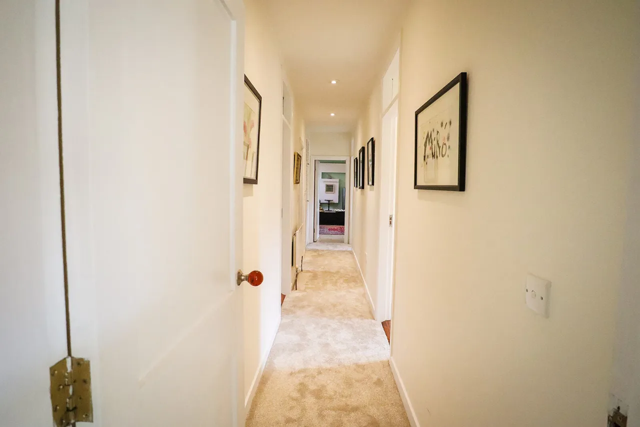 Connecting Hall 7.43m x 0.98m Fitted carpet flooring and recessed lighting.