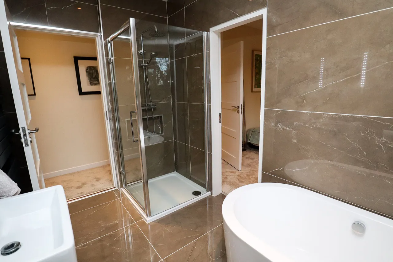 En-Suite 1.47m x 3.17m Comprising a fully tiled floor to ceiling wet-room shower fitted with a thermostatic pumped shower and glass panel. WC and wash-hand basin with tiled backsplash and overhead wall mounted lighting. Frosted window to the rear of the property. Heated towel rail, extractor fan and recessed lighting. Tiled floor.