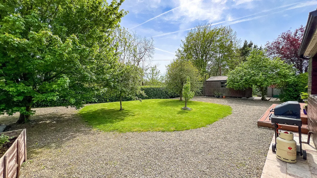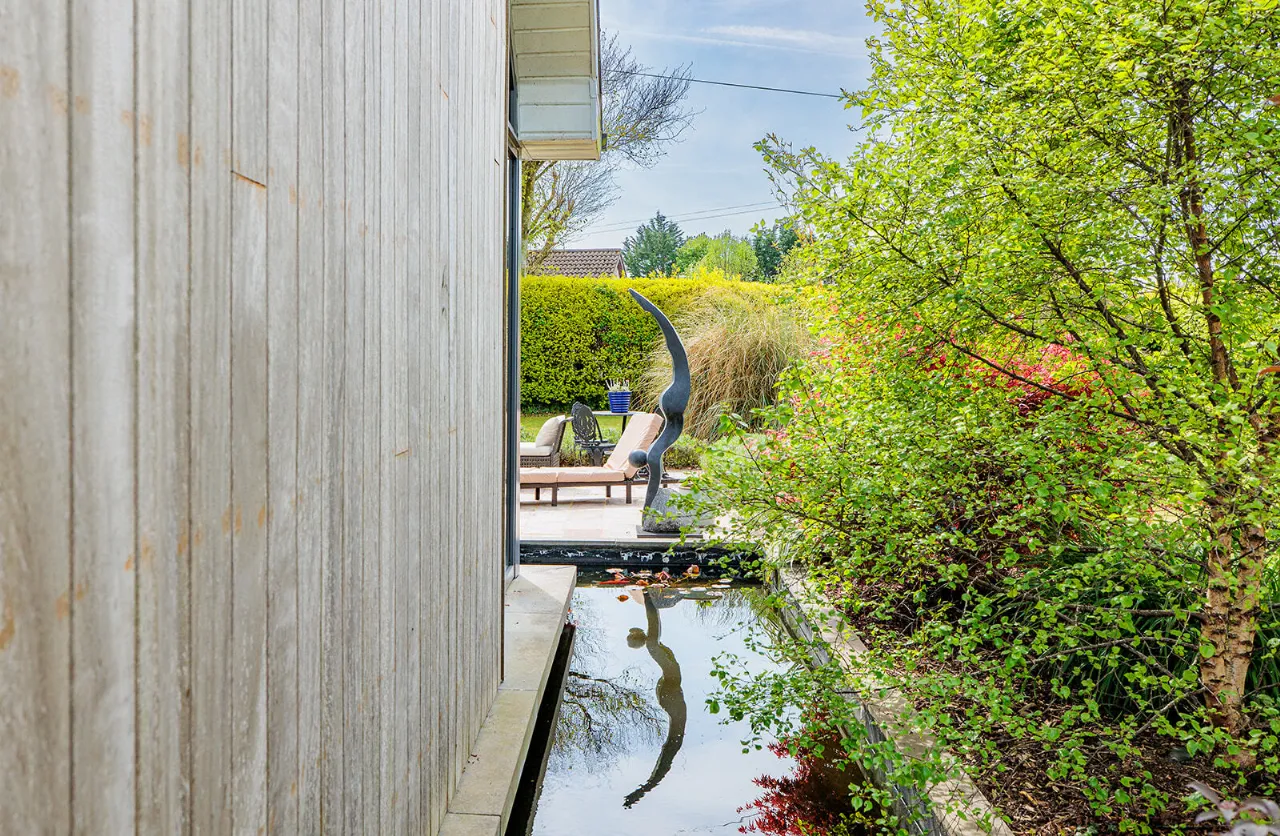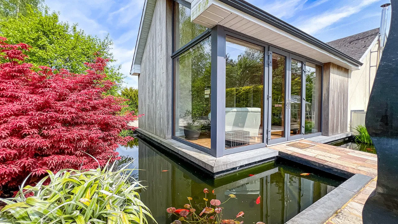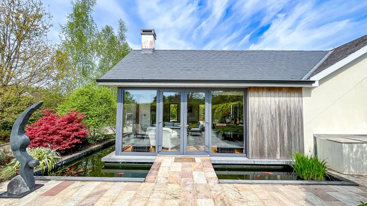 The front and side gardens feature a manicured lawn with a mini-Putting Green, extensive Herbaceous planting and a modern Architectural Pond with an adjoining large sun-drenched Sandstone patio area.