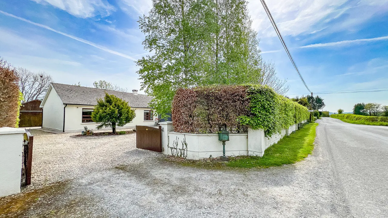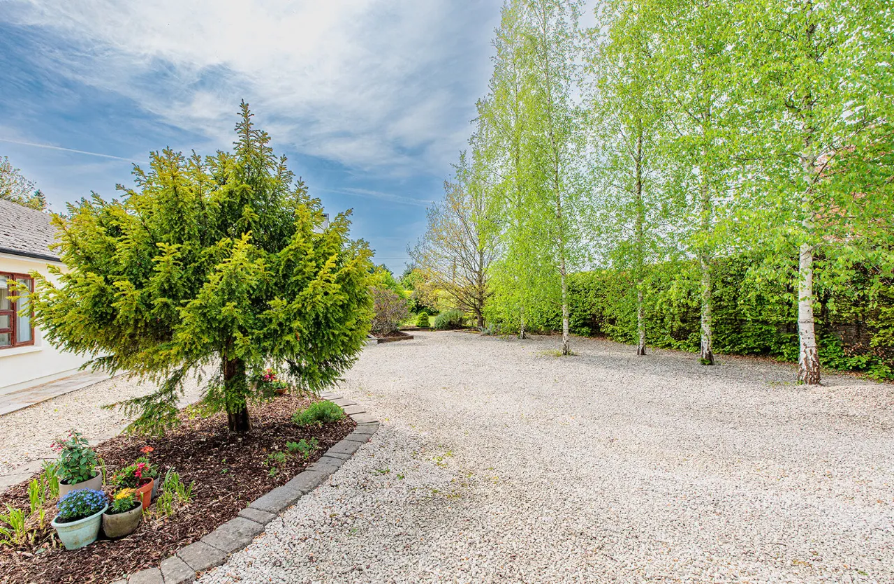 The property is well shielded from the road with a high Beech hedge planted behind the wall which runs along the boundary line with the road. Teak hardwood entrance gates open into an extensive gravelled parking which provides parking for several cars.