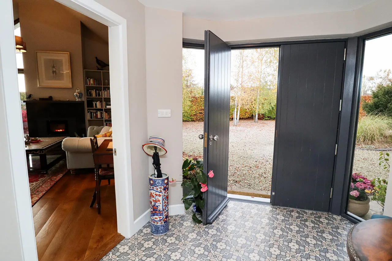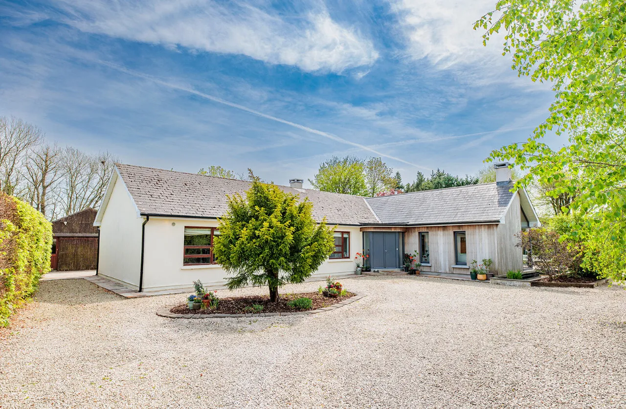 Upon entering, you are welcomed by a bright hallway with a Composite front door and decorative floor tiling, setting the tone for the quality throughout. To the front of the house lies a stylish and sun-drenched triple aspect sitting room with a vaulted ceiling, feature Kilkenny Limestone fireplace, fitted with a recessed Stovax wood burning stove, while to the rear, the heart of the home is the stunning open-plan kitchen/dining/living area. This space is a true showpiece, with a reconditioned oil-fired Aga range cooker and super-sized sliding door opening to a generous rear garden – perfect for entertaining or everyday life. A utility room is located just off the kitchen area.