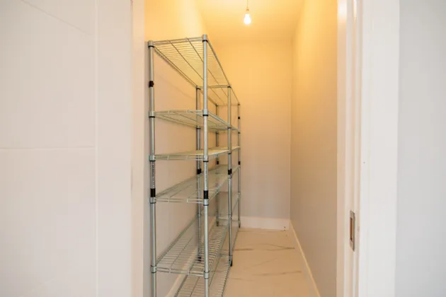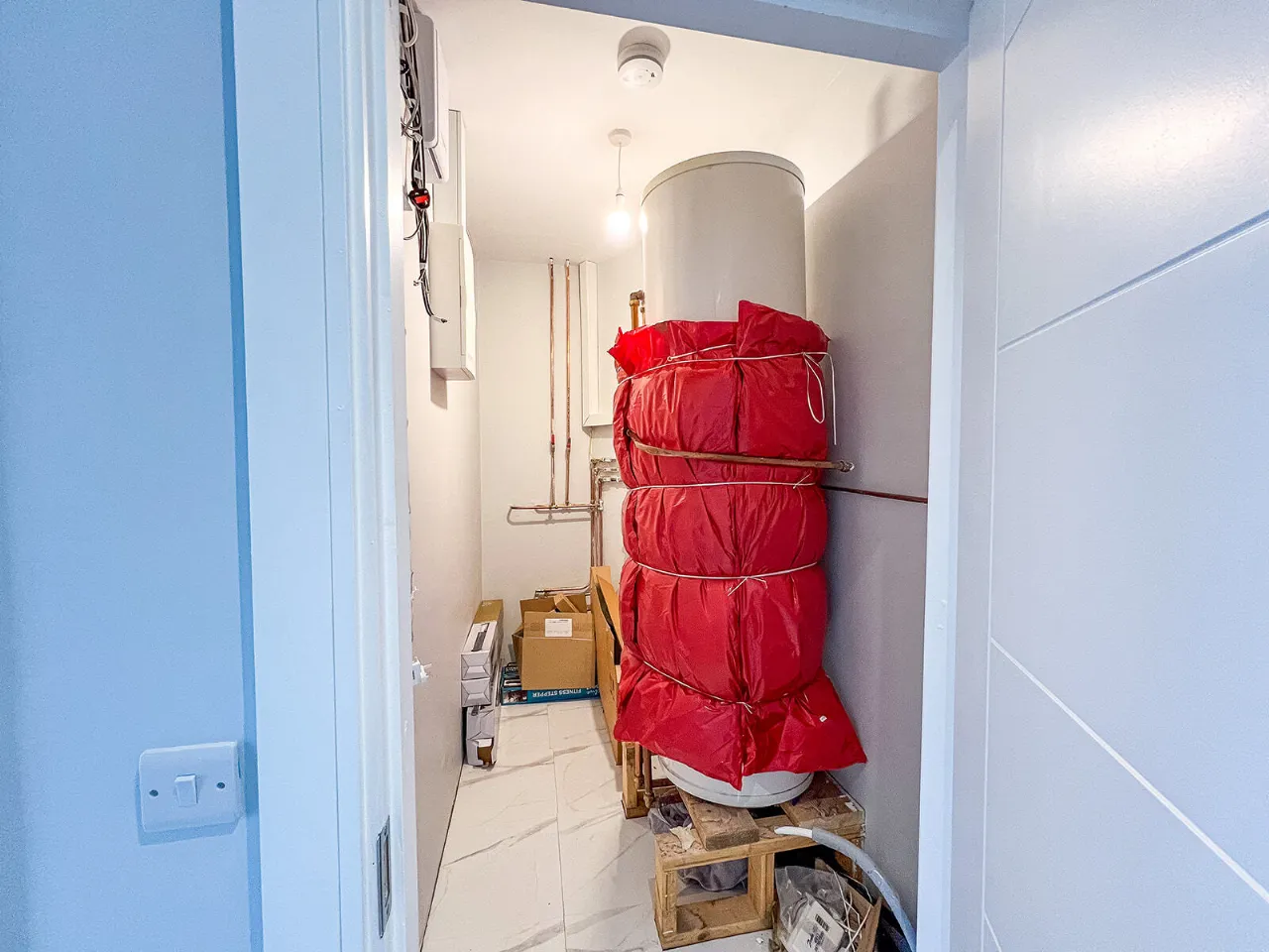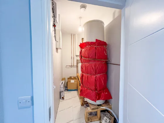 Walk-in Hot Press / Plant Room 1.70m x 2.70m Gledhill Stainless unvented hot water cylinder, fuse box and alarm box. There is space to fit shelving for linen and towels.