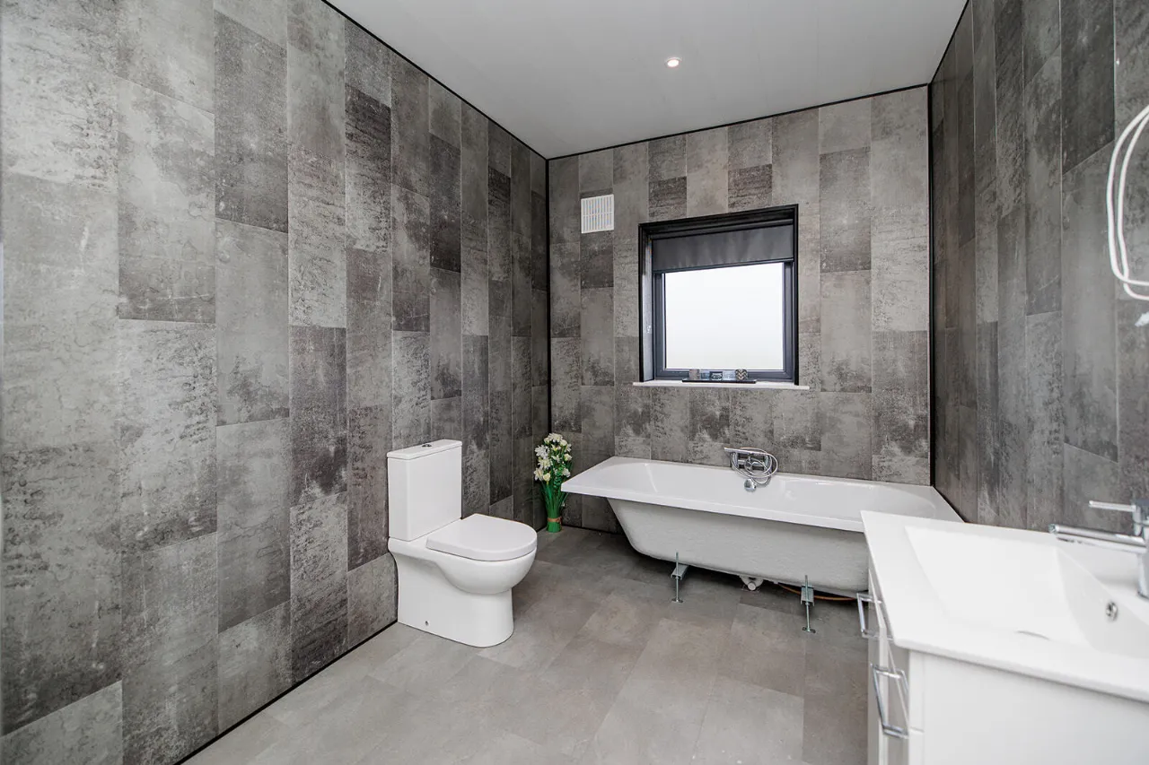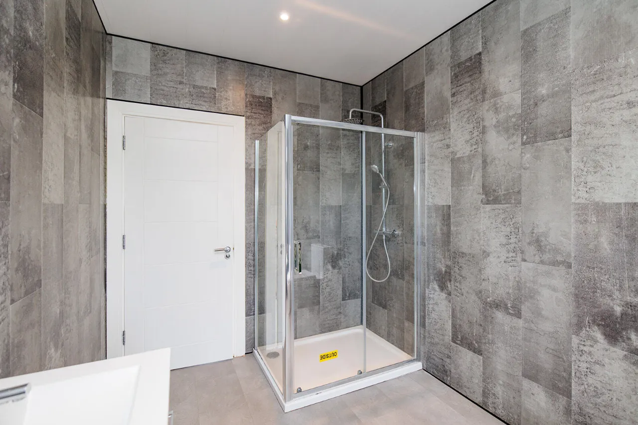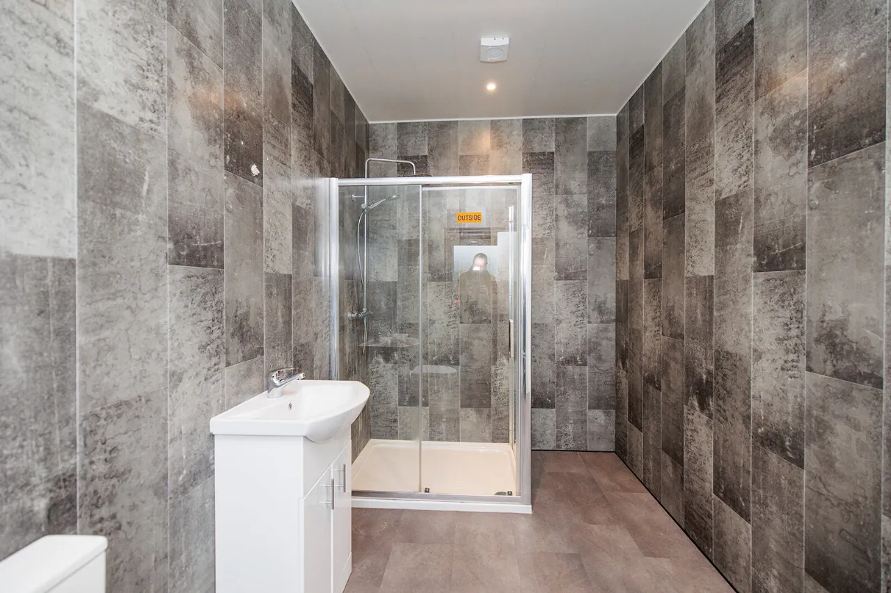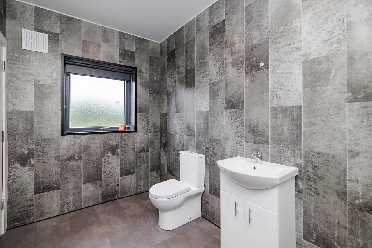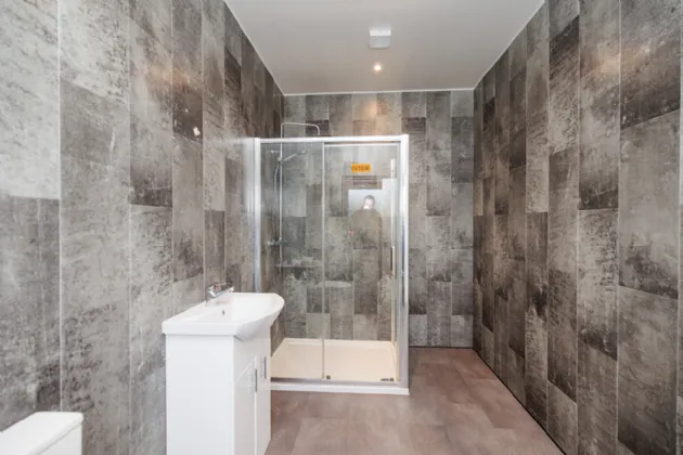 En-Suite 3.63m x 1.96m Comprising an enclosed double shower cubicle fitted with an unvented pressurised shower with a rainshower head and hand-held attachment. WC and vanity unit with underneath storage. Frosted gable end window. Recessed ceiling lights and extractor fan. Floor to ceiling cladding tiled effect walls. Tiled effect floor.