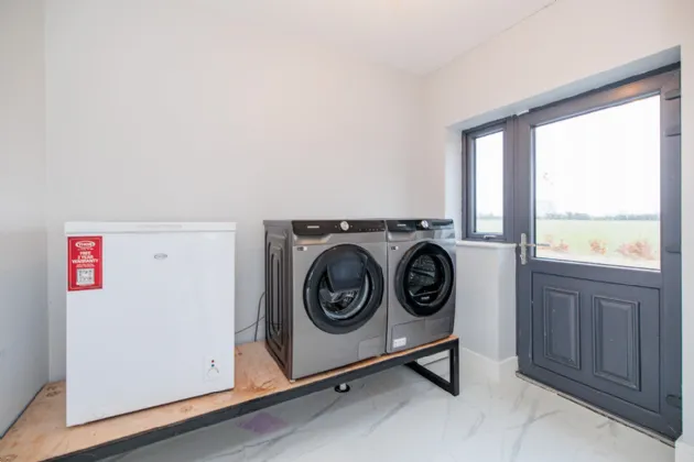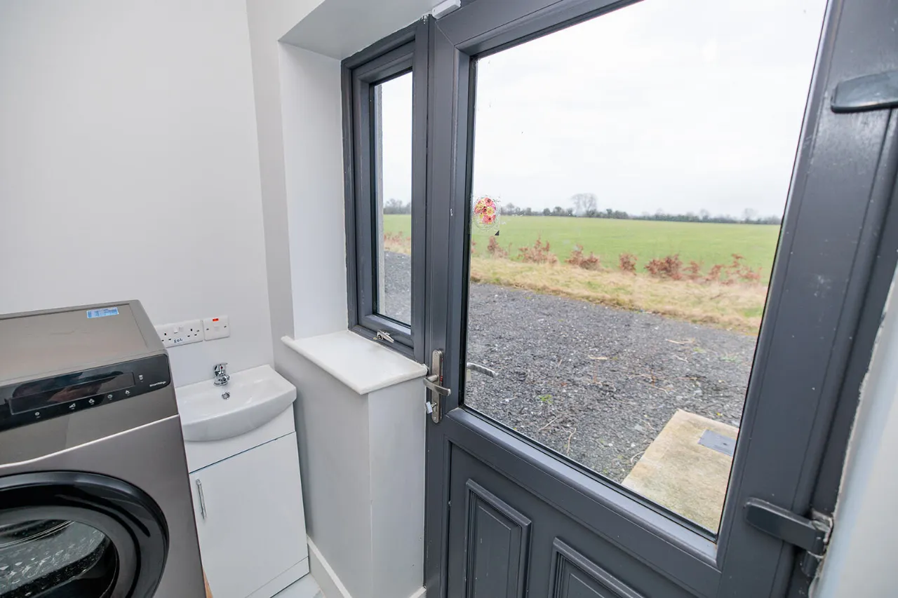 Utility Room 2.08m x 2.75m Plumbed for washing machine with space for a tumble dryer and chest freezer. Fitted vanity unit with wash hand basin and underneath storage. Composite back door with glass insert and side window opening. Alarm panel.