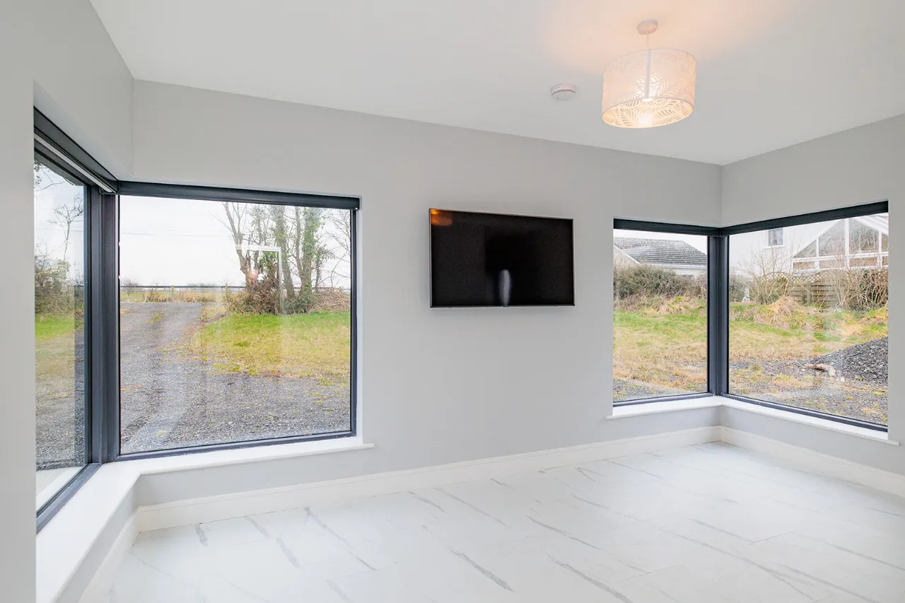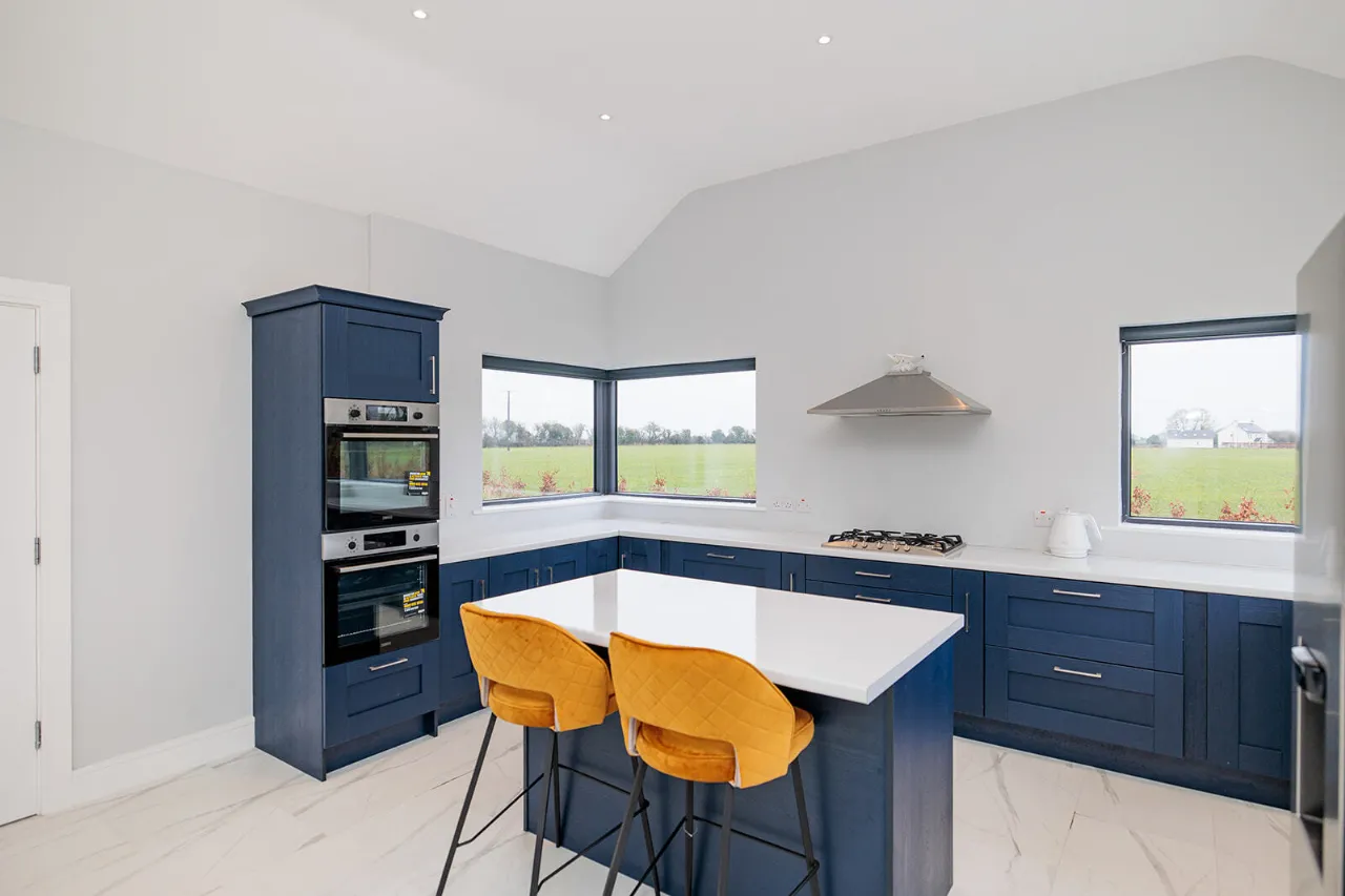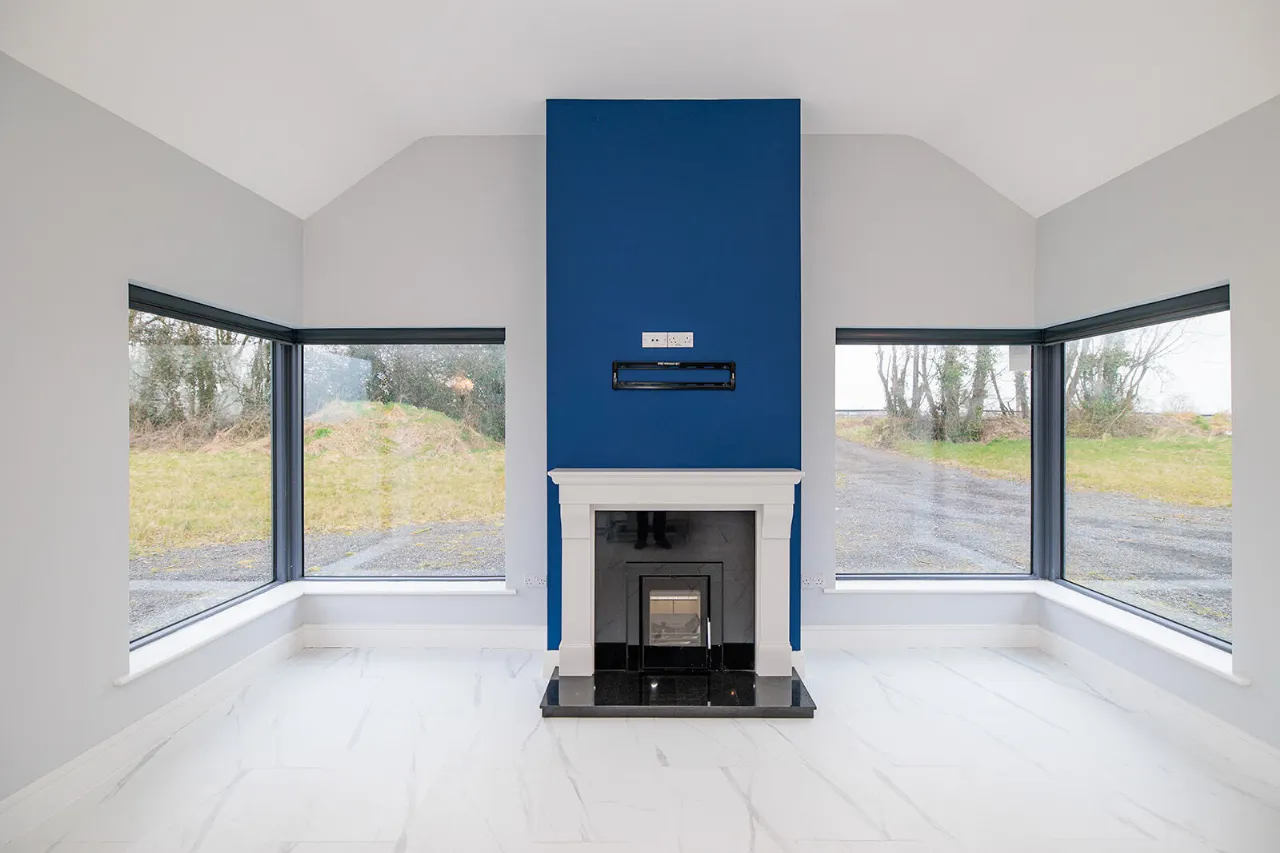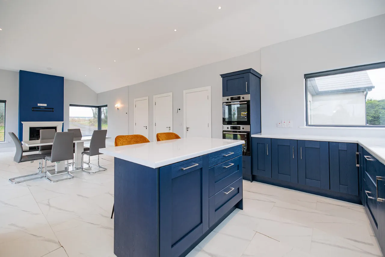 Living Room / Dining Room / Kitchen 4.80m x 11.11m Impressive and exceptionally large sun-drenched open plan room with triple aspect views of the gardens and the surrounding countryside. The room features a vaulted ceiling throughout with recessed lighting. The kitchen area fitted with Modern Blue coloured fitted Shaker-Style wall and floor units with white Quartz effect laminate worktops and 1.5 bowl kitchen sink. Two Zanussi electric ovens and Smeg five ring gas hob (bottled gas). Stainless steel extractor hood. Samsung dishwasher and American Fridge/freezer. Matching kitchen island with underneath storage drawers, built-in bins and space for two bar stools. Two large corner picture windows overlook the rear and side gardens with viewing of the surrounding countryside. The dining area can accommodate a large table and chairs for family dining and entertaining. French doors with glass side panels open out to the side of the property. The living area features a striking Marble open fireplace and hearth, fitted with a recessed Vitae Cassette stove. Two large corner picture windows overlook the front and side gardens. Two wall mounted lights. Electric blinds on all the windows and French doors.