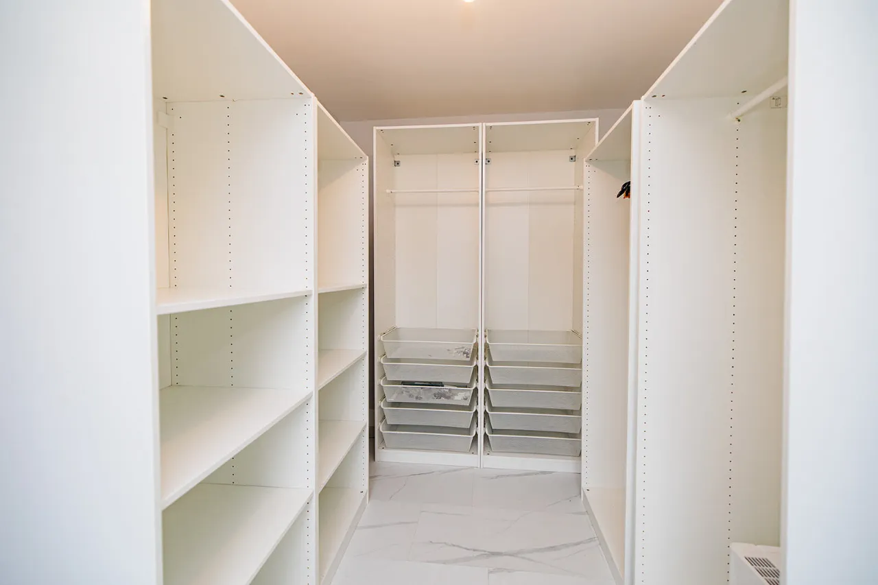 Dressing Room 3.67m x 2.44m Tall free-standing units with hanging space, shelving and pullout storage baskets. Gable end window fitted with electric blind.