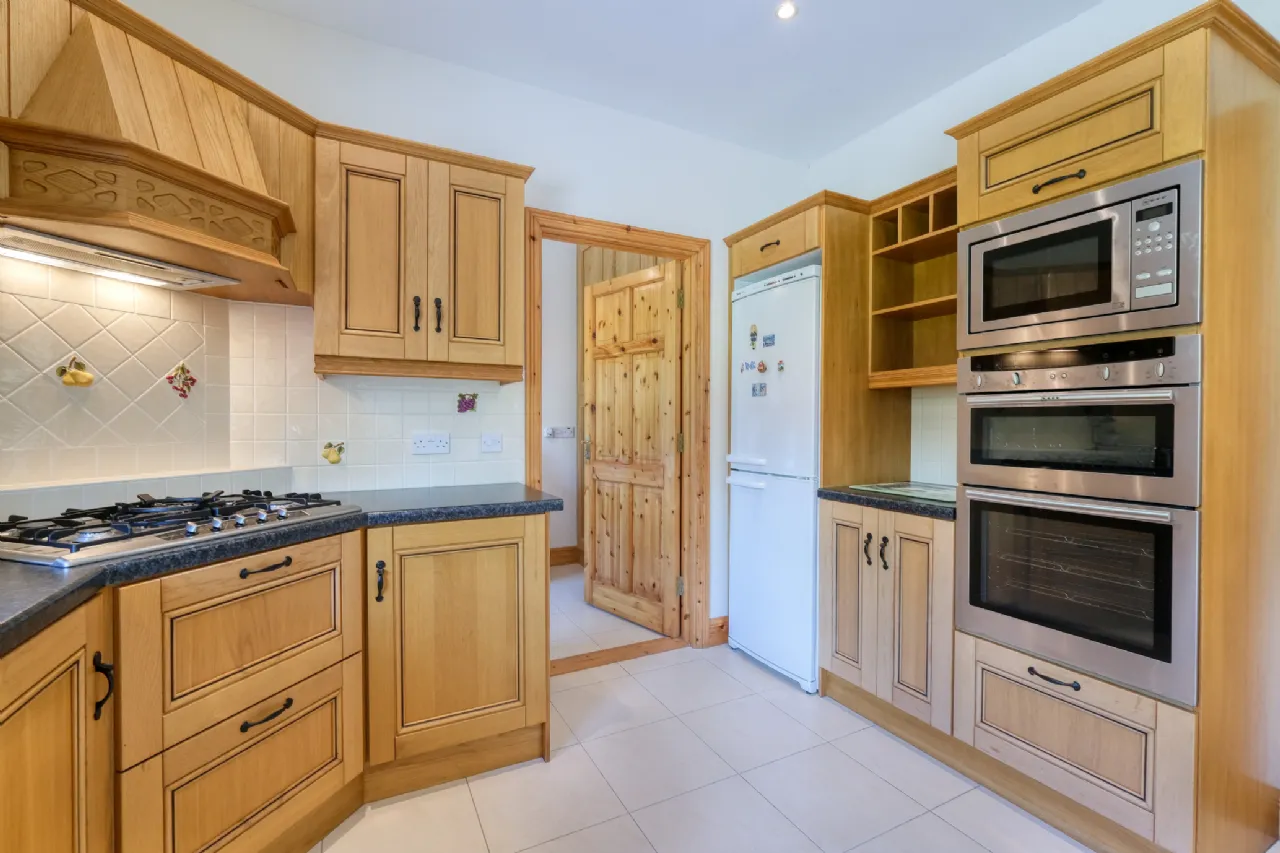 The sitting room has an open fireplace, engineered wood floors and double doors that connect to the large kitchen / Dining area. The dining area has double glass doors that open out onto the south west facing patio area which is a real sun trap and ideal for an evening BBQ. This area also has a combination of engineered wood and tiled floors. There are substantial built in kitchen units with a breakfast bar, integrated Neff appliances and a gas hob. The kitchen space is complimented by a large utility room that is plumbed for a washing machine and dryer.