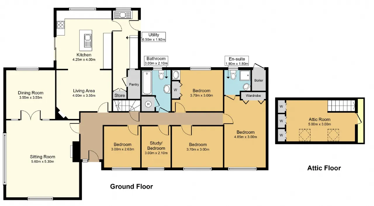 There are three double sized bedrooms and two single bedrooms. One of these single bedrooms would make an ideal study or home office, taking advantage of the Gigabit broadband that is available here. The main bedroom is ensuite and the other bedrooms are served by a fully tiled family bathroom.