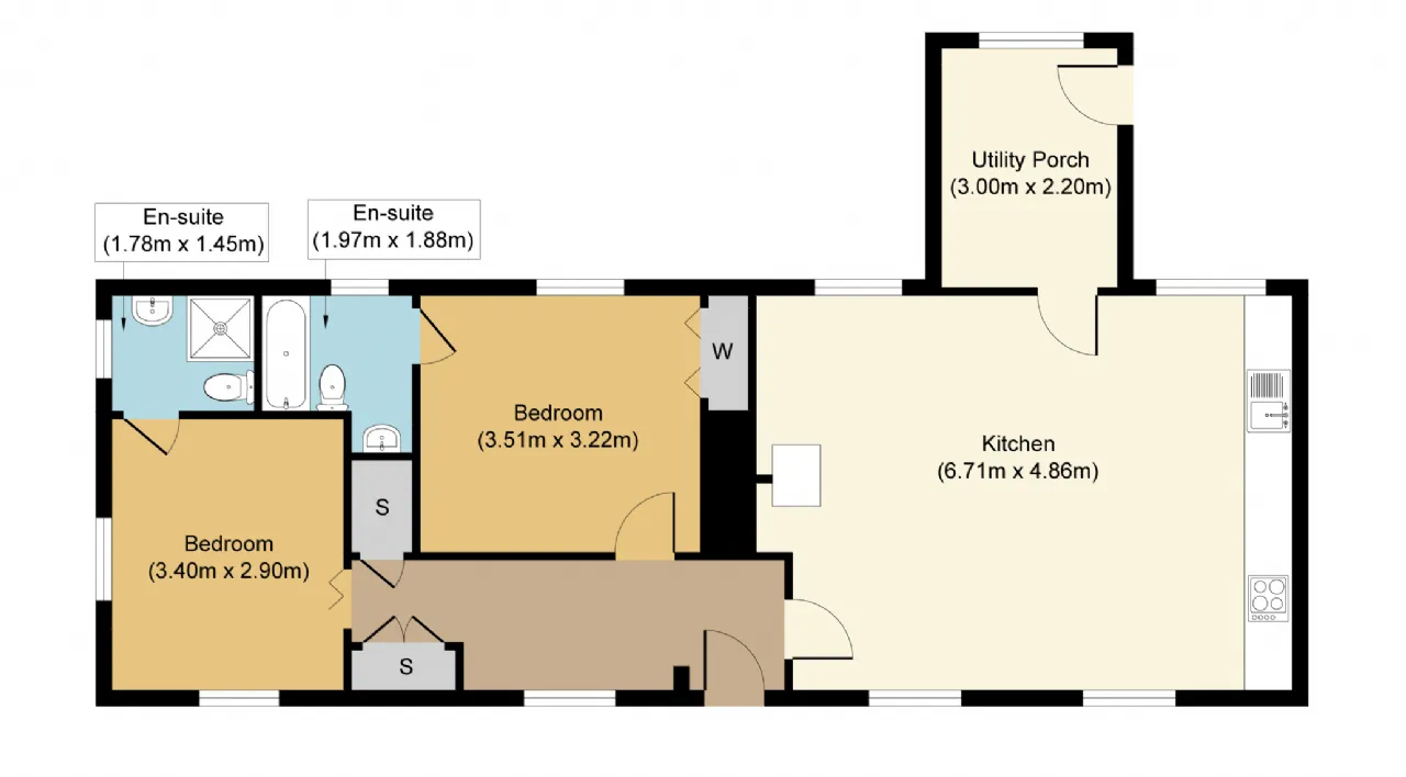 The 2 bedroom cottage would have been built in the 1950’s and is presented in very good condition. There is an open plan kitchen / dining living area with modern kitchen built in kitchen units and laminate flooring. There is a solid fuel stove that runs the central heating in the house. Complimenting the kitchen is a rear utility porch. There are two bedrooms and both are ensuite with fully tiled shower rooms.