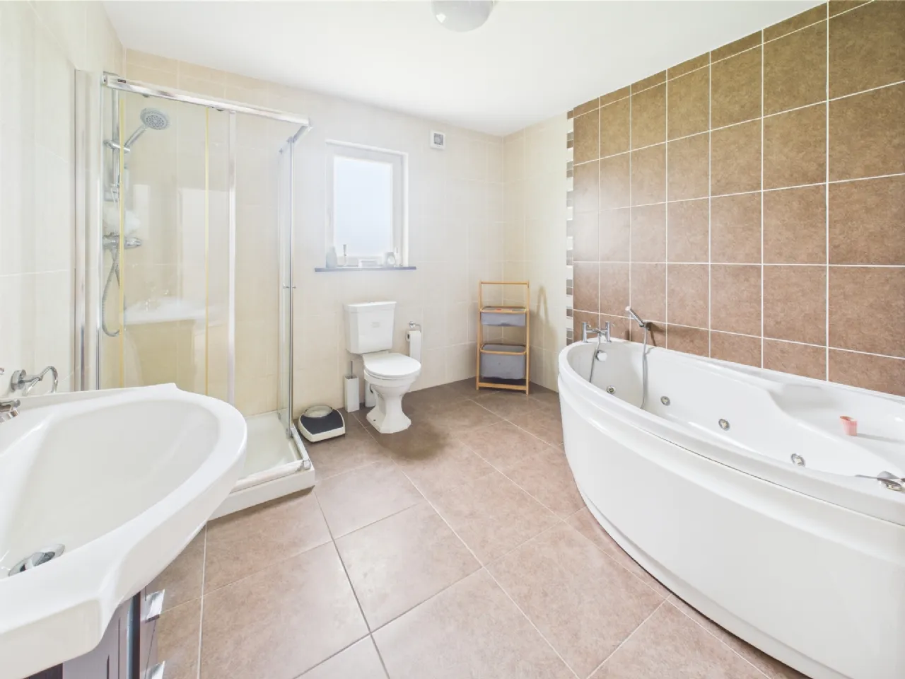 Tiled Bathroom 2.9m x 2.8m with corner bath, shower, wc and handbasin
